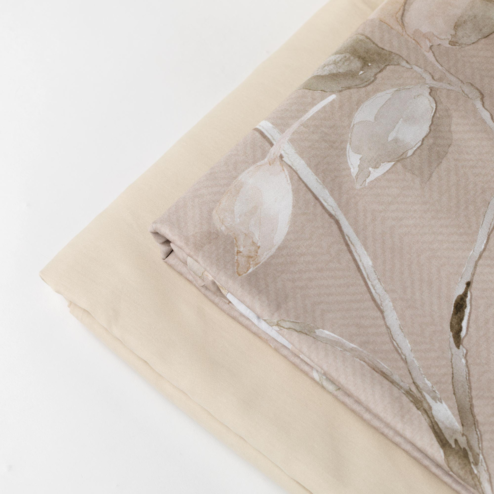 La confezione contiene lenzuolo sopra, lenzuolo sotto con angoli e federe a sacco