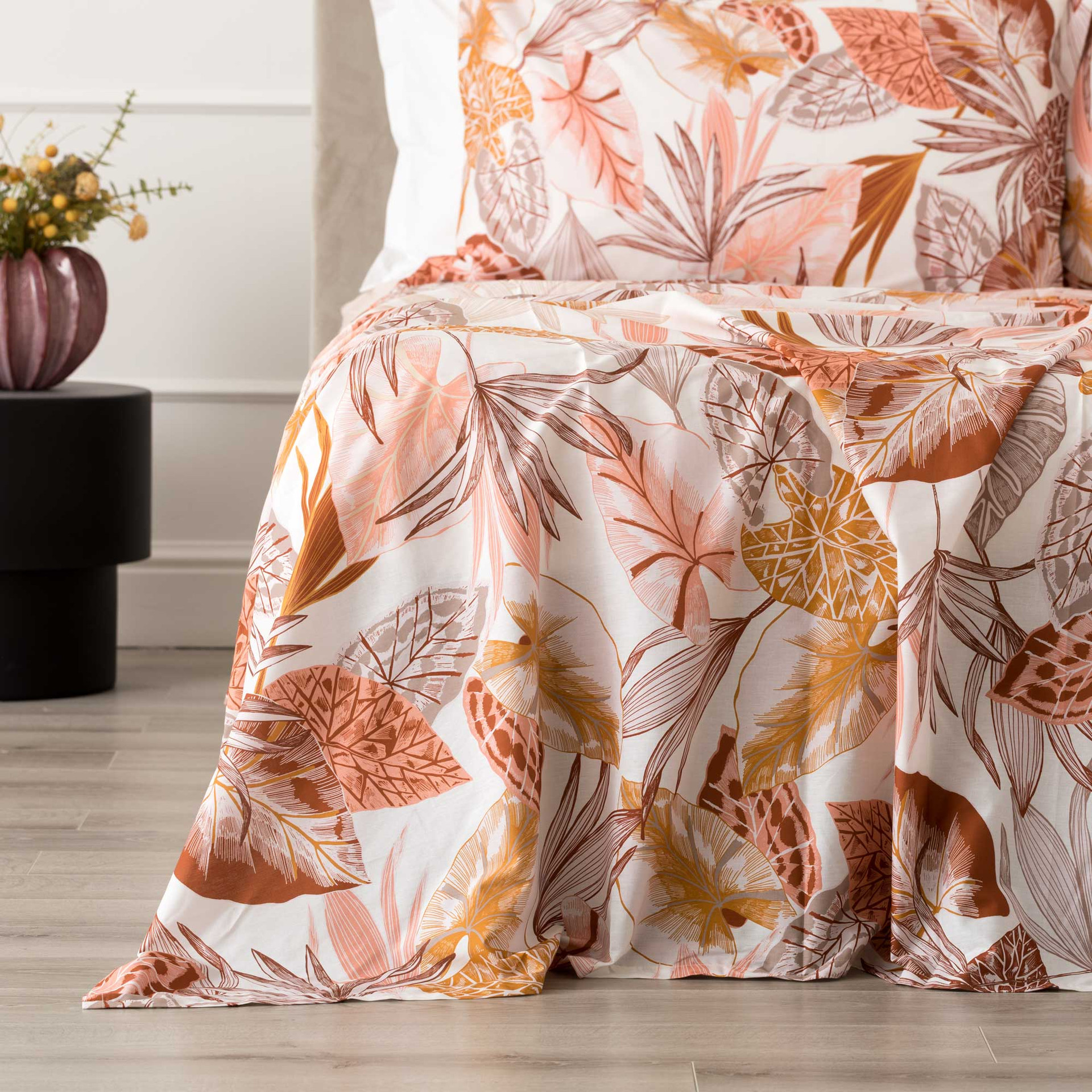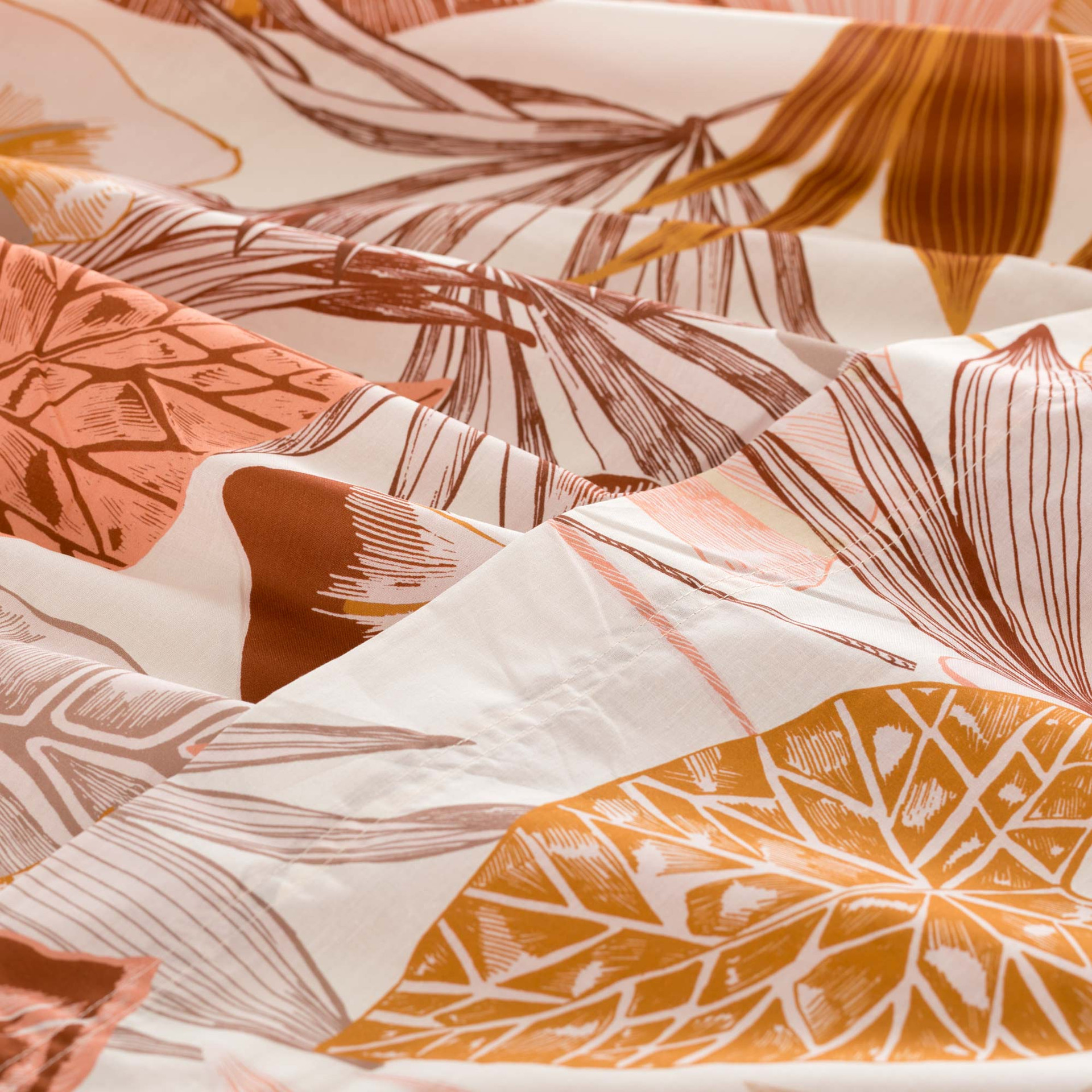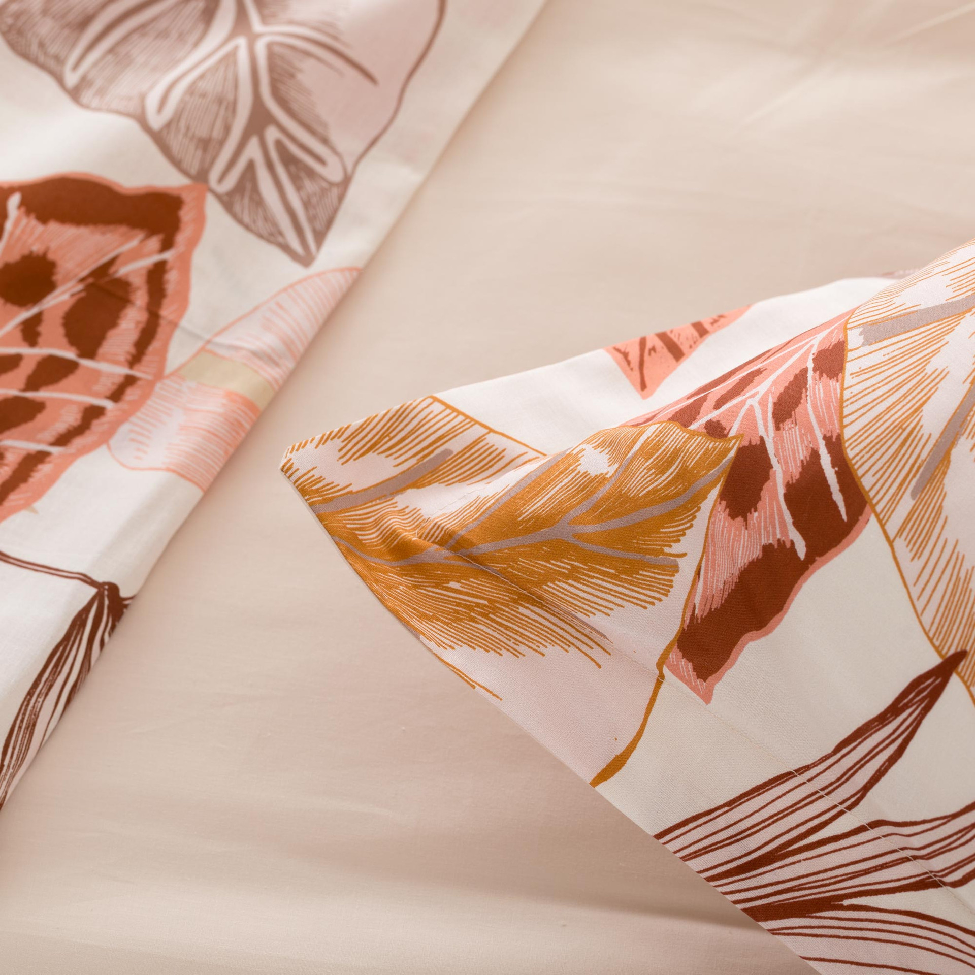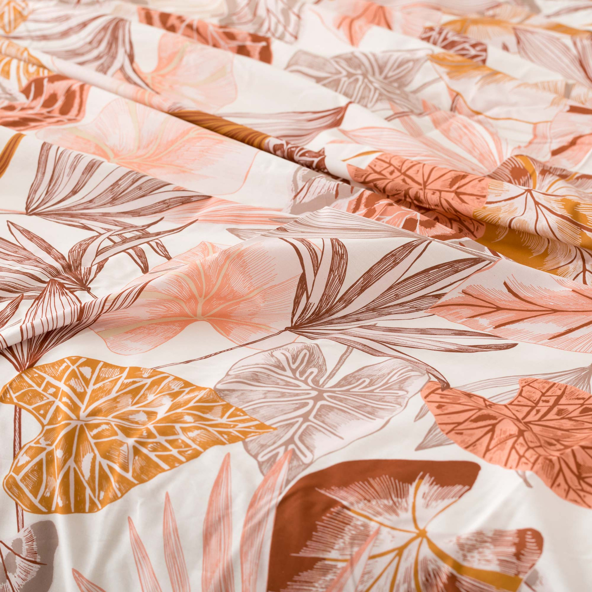 Il completo lenzuolo copriletto Arjola in percalle 100% cotone porta in camera un’estetica tropicale raffinata, interpretata con equilibrio e leggerezza attraverso una stampa digitale dal tratto quasi illustrativo. Il disegno, fitto e dinamico, intreccia foglie di palma, banano e monstera in una composizione elegante, dove le tonalità sabbia, terra e rame si sovrappongono creando profondità visiva e movimento. Il sotto lenzuolo e il retro delle federe in tinta unita bilanciano l’insieme, mentre il percalle assicura una mano fresca, liscia e naturalmente traspirante.