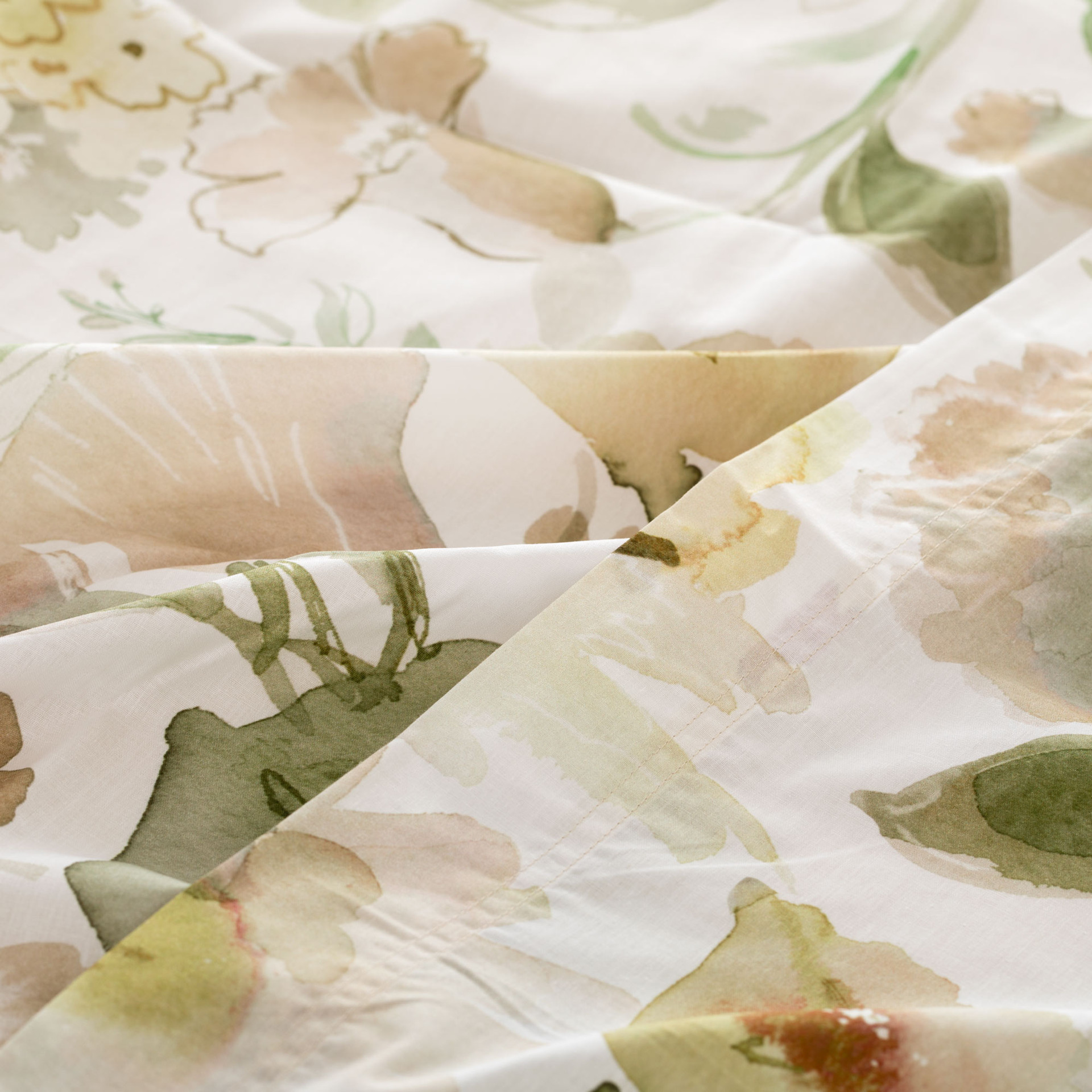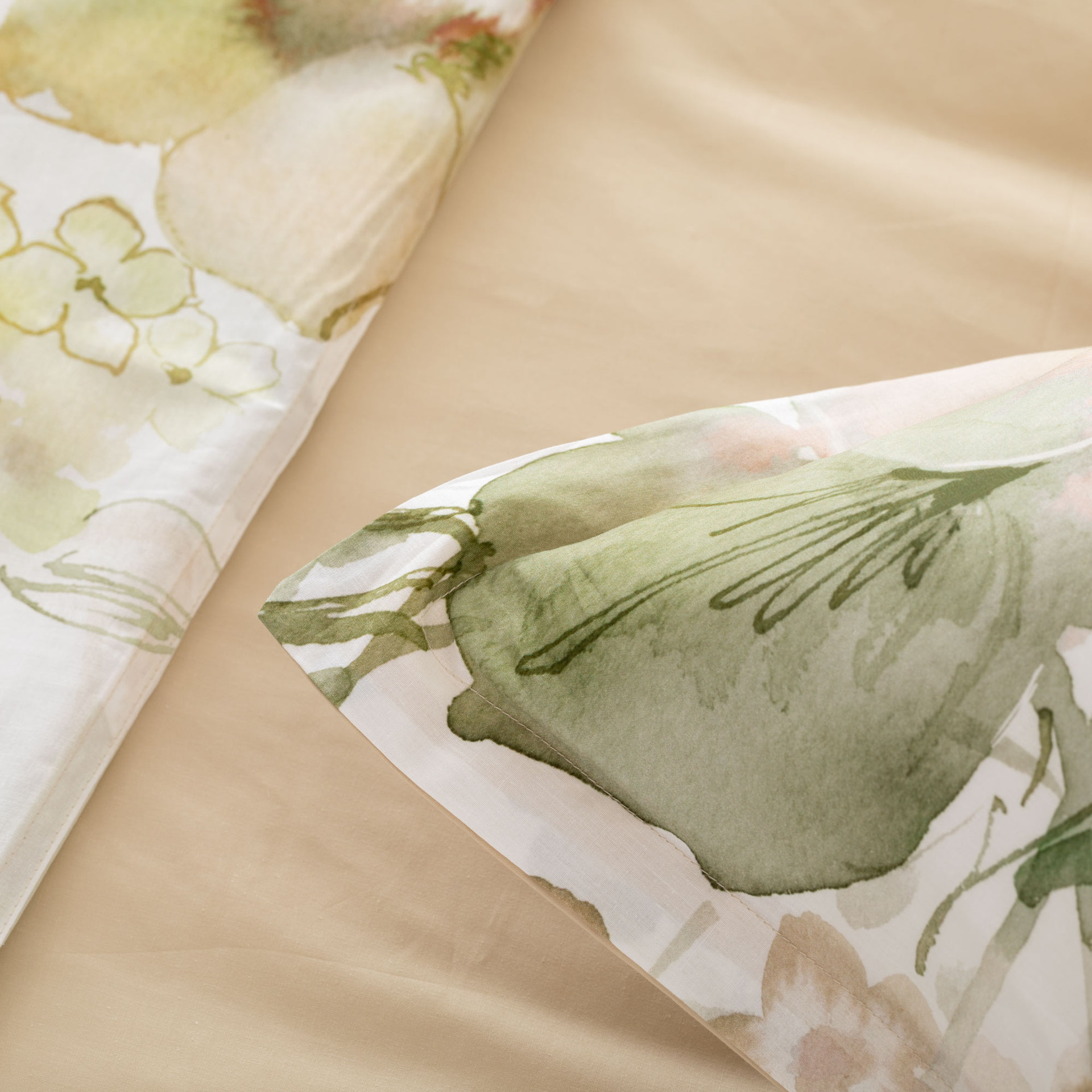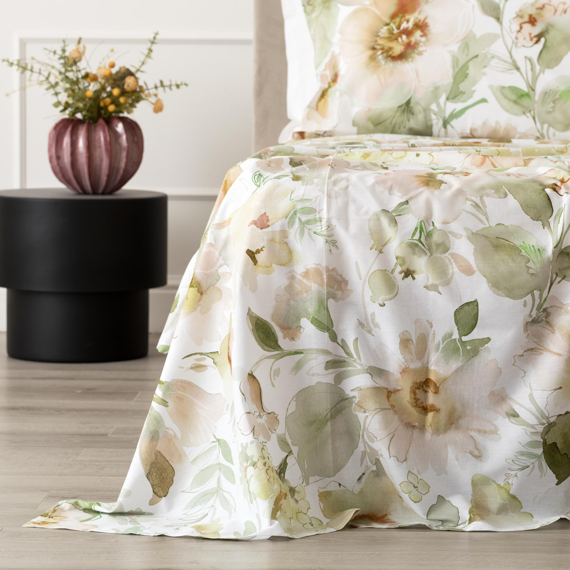 Il completo lenzuolo copriletto matrimoniale Melika porta in camera un’eleganza floreale contemporanea grazie alla stampa digitale su percalle 100% cotone, che restituisce colori intensi e dettagli nitidi. Il motivo botanico, raffinato ma attuale, dialoga con il sotto lenzuolo e il retro delle federe in tinta unita, creando un equilibrio visivo pensato per ambienti curati e luminosi. La texture del percalle è fresca, liscia e compatta, ideale per chi cerca qualità tessile e comfort quotidiano.