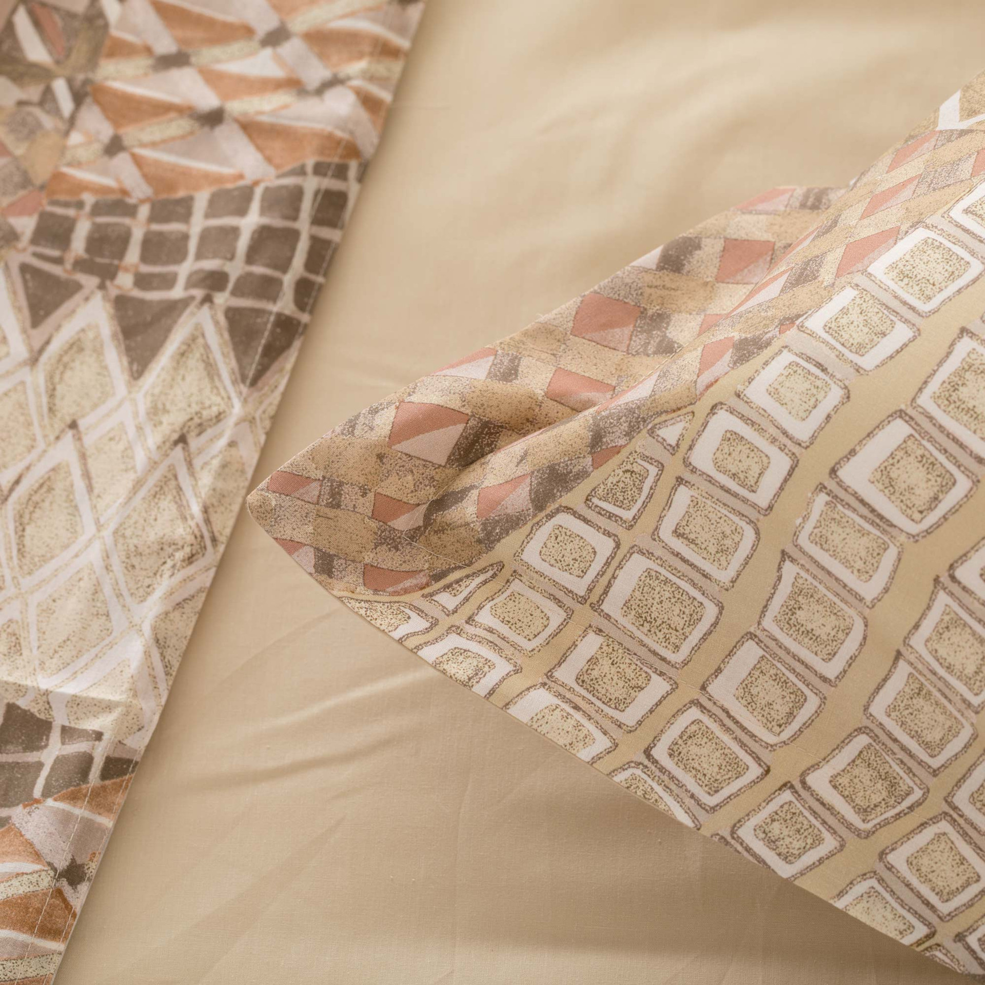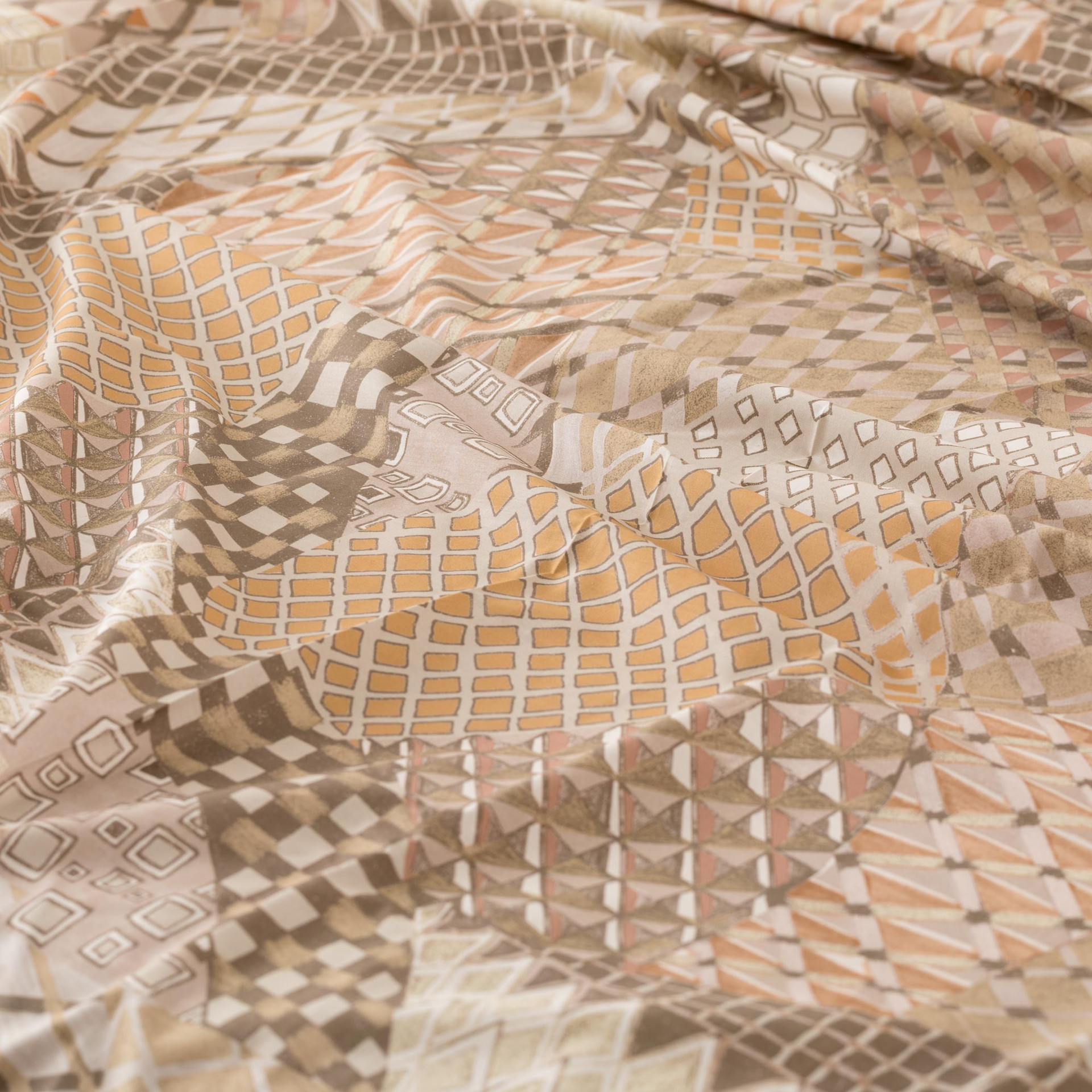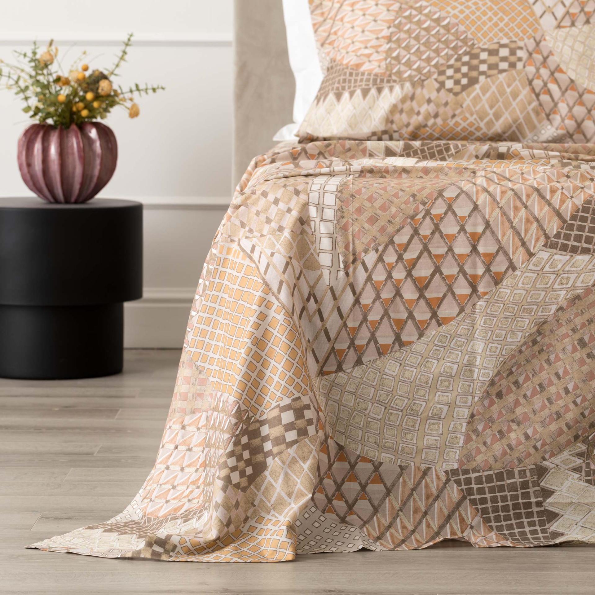 Il completo lenzuolo copriletto Valma in percalle 100% cotone celebra la bellezza della manualità e delle culture ancestrali, trasformandole in un motivo decorativo ricco, materico e vibrante. La stampa digitale crea un patchwork di geometrie minute, rombi, losanghe e intrecci disegnati con minuzia, ispirati alle trame delle stuoie e ai dettagli delle lavorazioni artigianali. Un omaggio alla tradizione in chiave moderna, equilibrato da una palette sofisticata e dal sotto lenzuolo e retro federe in tinta unita. Il percalle regala una mano fresca, liscia e naturalmente traspirante.
