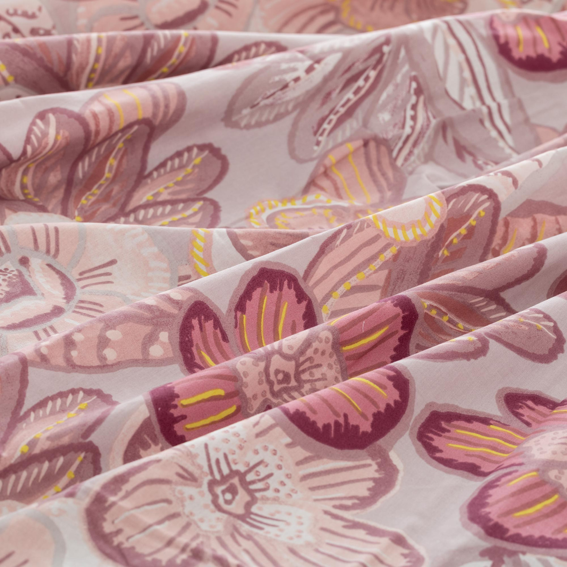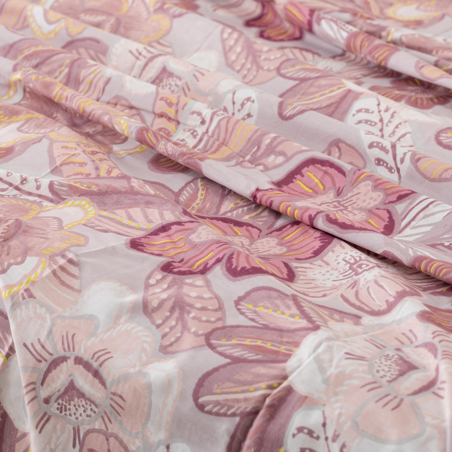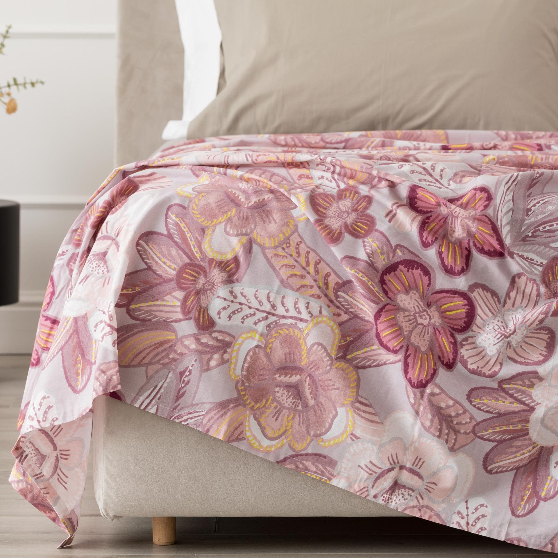 Gledia coverall in cotone stampato porta nella zona notte un’eleganza naturale fatta di motivi floreali armoniosi e cromie morbide. Il disegno, ricco di dettagli ma ben equilibrato, crea un effetto visivo raffinato che valorizza il letto e contribuisce a rendere l’ambiente accogliente e luminoso, ideale per chi ama uno stile decorativo delicato ma riconoscibile.