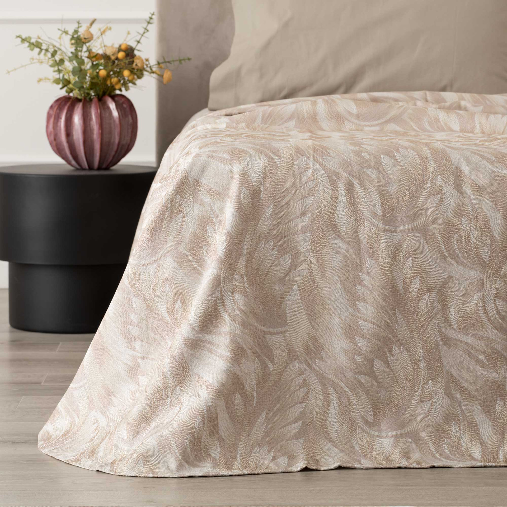 La lavorazione jacquard non è una semplice stampa: il disegno nasce direttamente dalla trama del tessuto, dando vita a una texture tridimensionale che cattura la luce e restituisce profondità visiva. Il risultato è un copriletto che arreda con discrezione, ma con una forte identità.