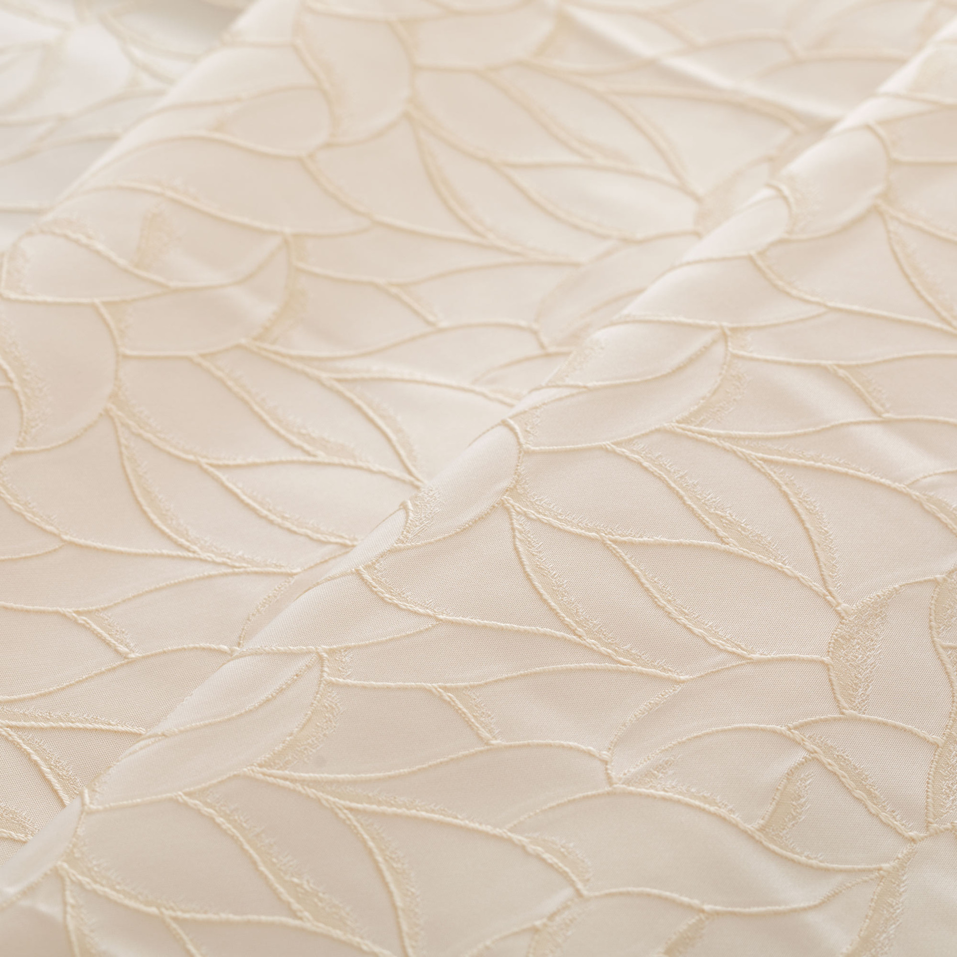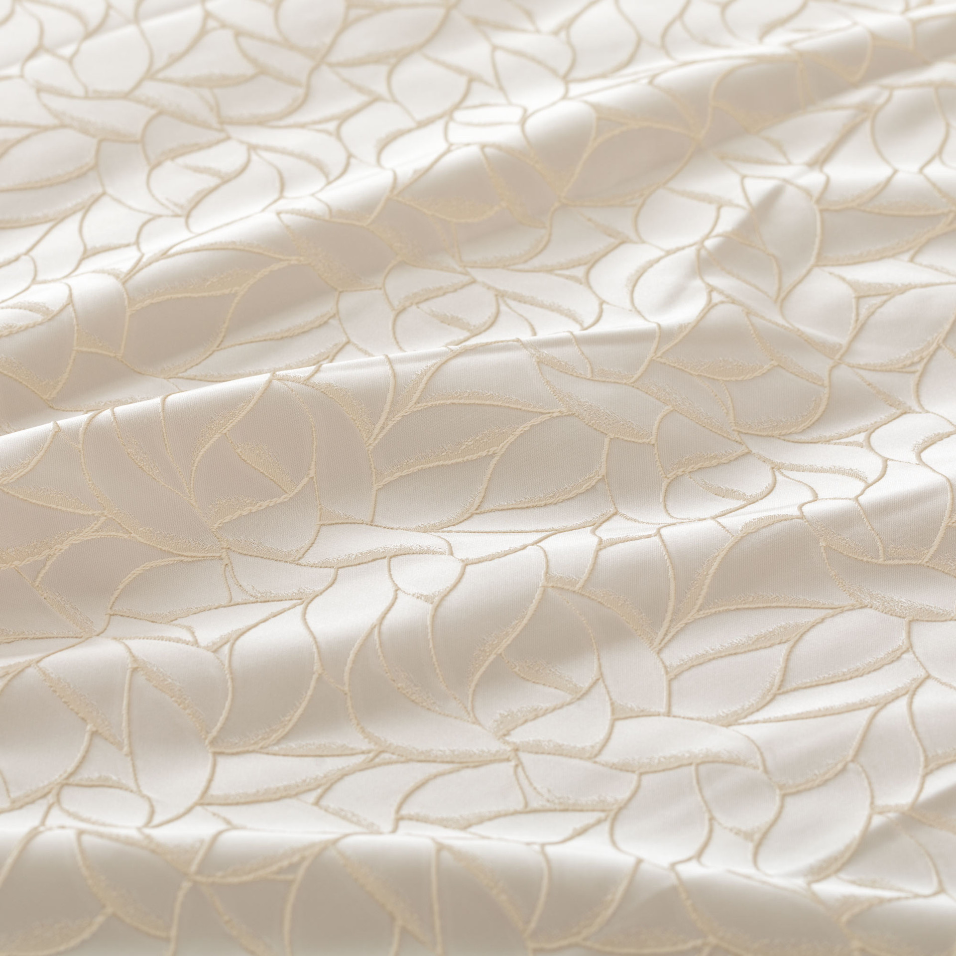 La lavorazione jacquard rende il disegno parte integrante della struttura del tessuto, generando una texture tridimensionale che cattura la luce e restituisce profondità visiva.