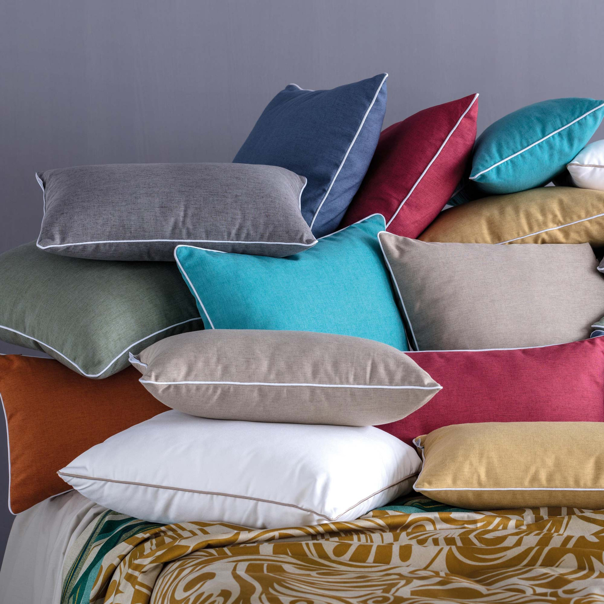 Tinta unita con piping perimetrale, sfoderabile.