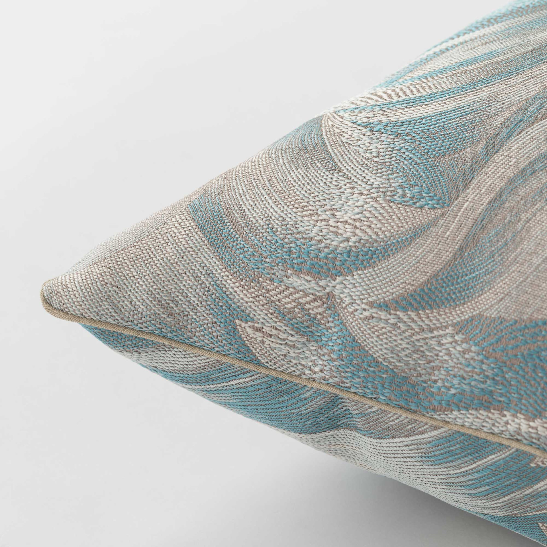 La lavorazione jacquard conferisce al disegno una texture ricca e tridimensionale: non è una semplice stampa, ma una trama che si percepisce anche al tatto, creando un raffinato gioco di luci e ombre. Il profilo in tinta lino incornicia il cuscino con discrezione, aggiungendo un dettaglio sartoriale che ne valorizza l’estetica.