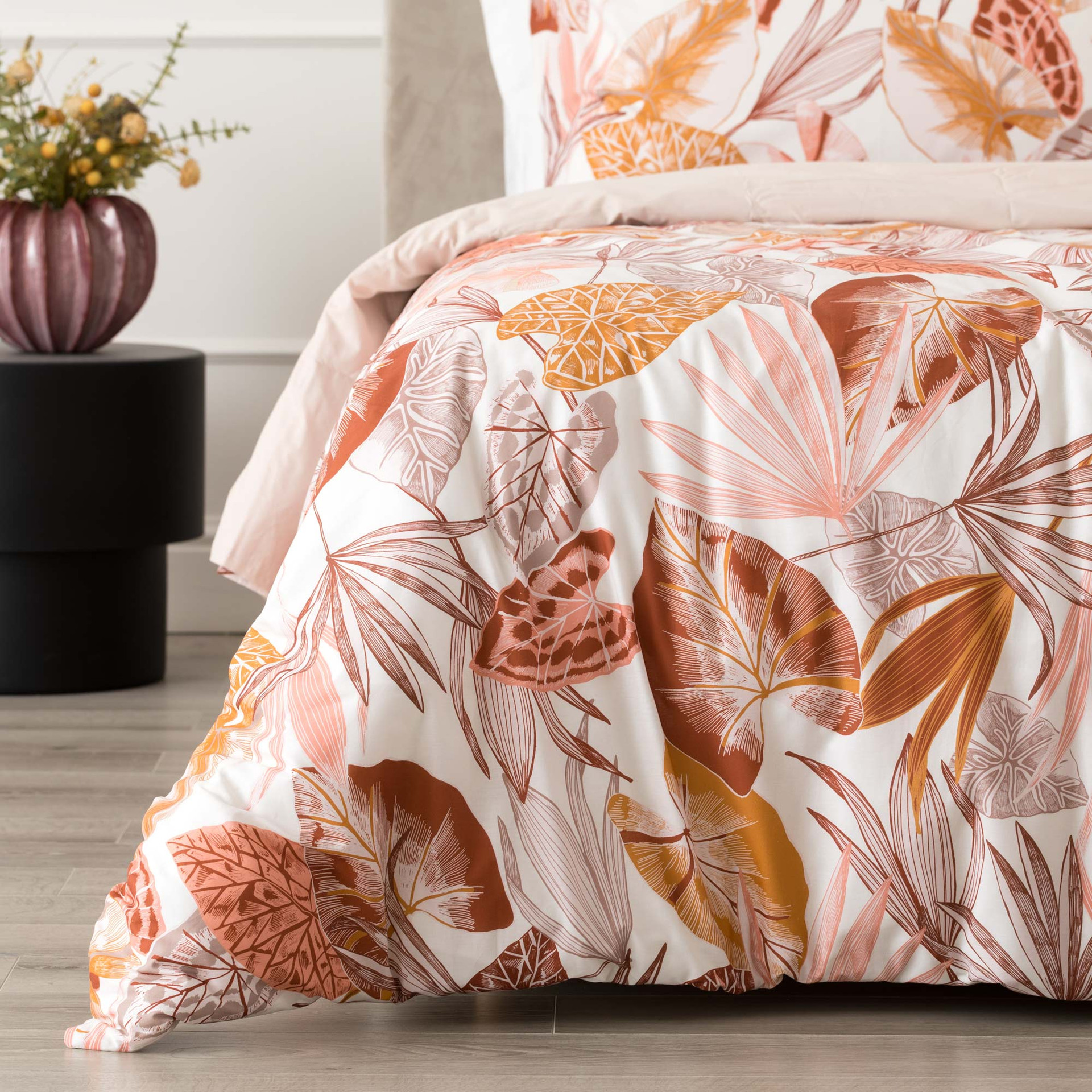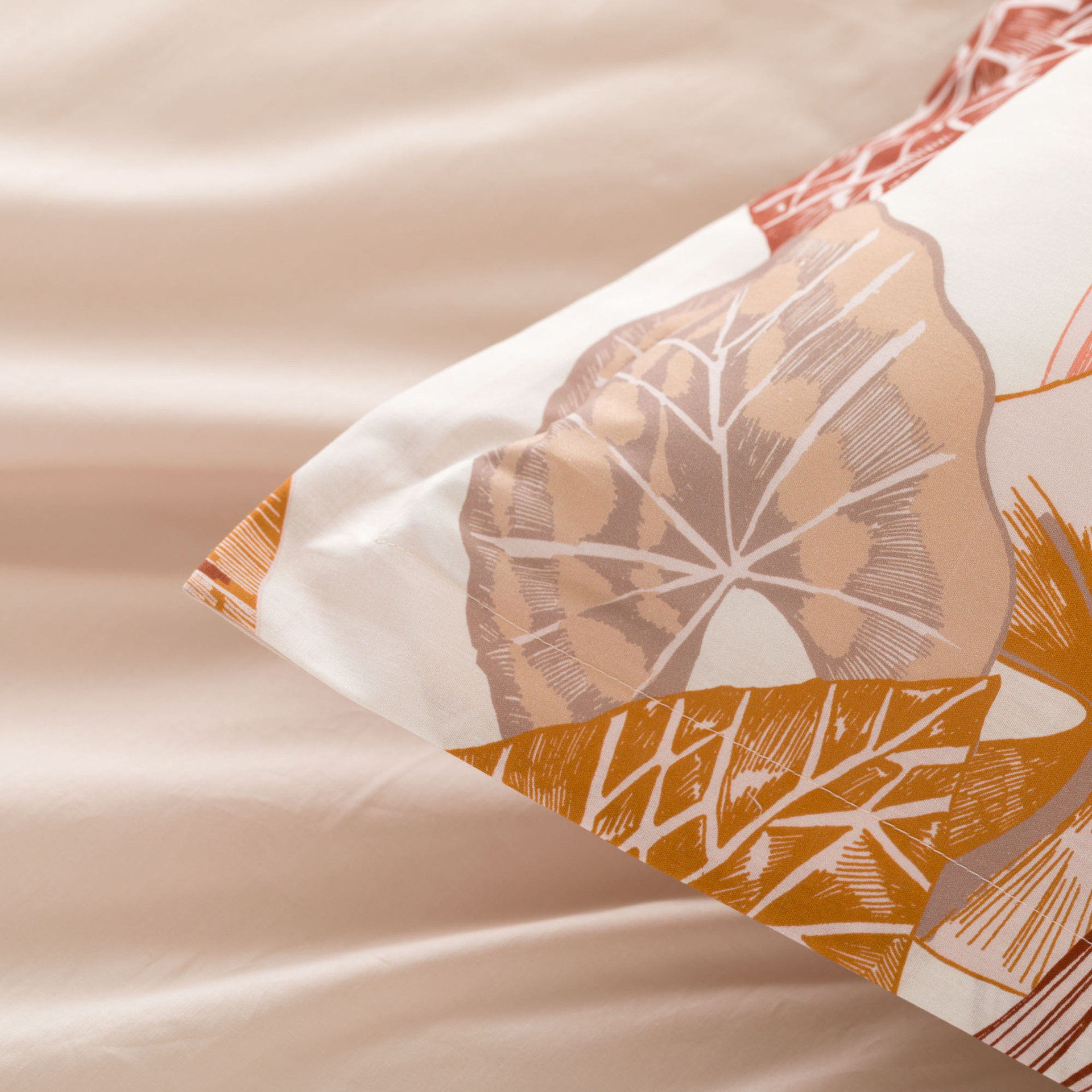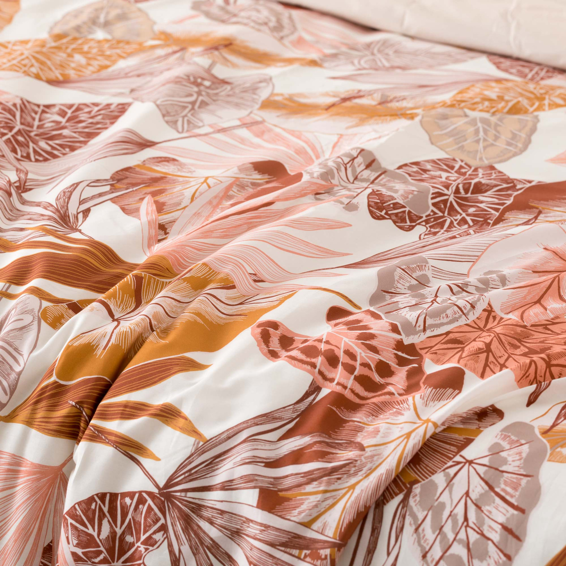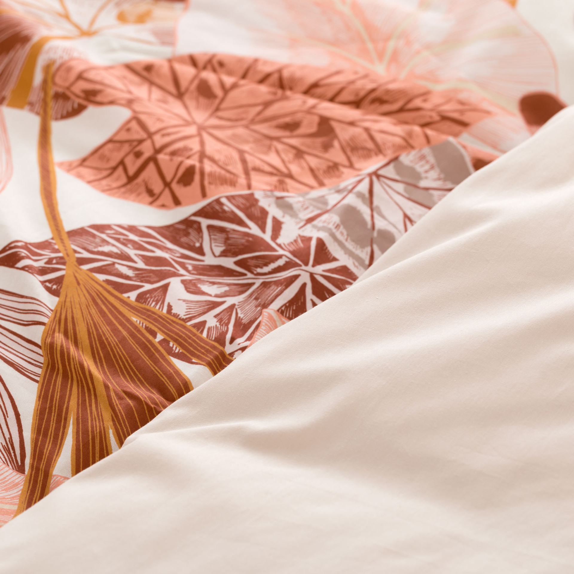 La parure copripiumino Arjola in percalle 100% cotone porta in camera un immaginario tropicale raffinato, interpretato con equilibrio e leggerezza attraverso una stampa digitale dal tratto quasi illustrativo. Il disegno, fitto e dinamico, intreccia foglie di palma, banano e monstera in una composizione elegante, dove le tonalità sabbia, terra e rame si sovrappongono creando profondità visiva e movimento. Il sotto sacco e il retro delle federe in tinta unita completano il look con discrezione, mentre il percalle regala una mano fresca, liscia e traspirante.