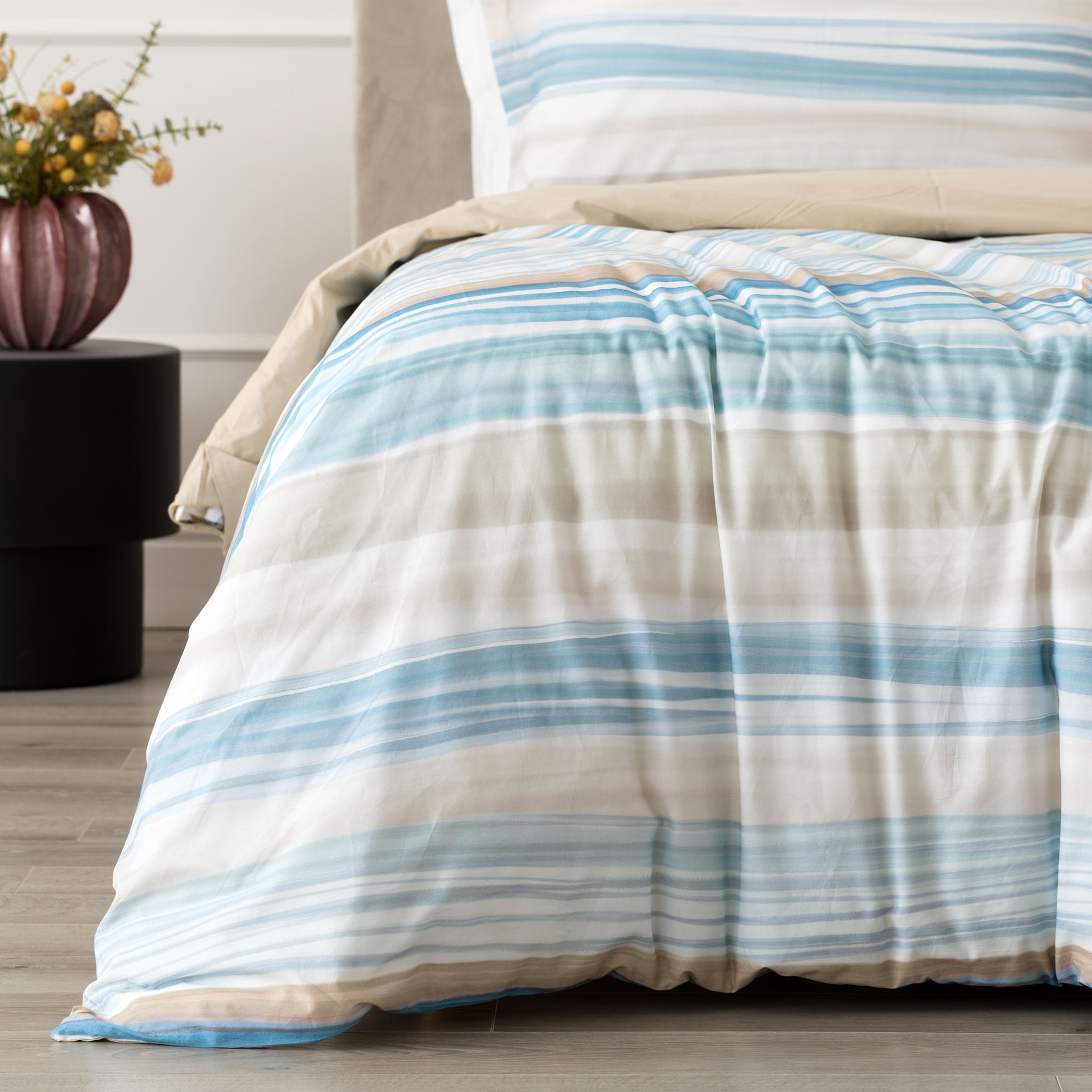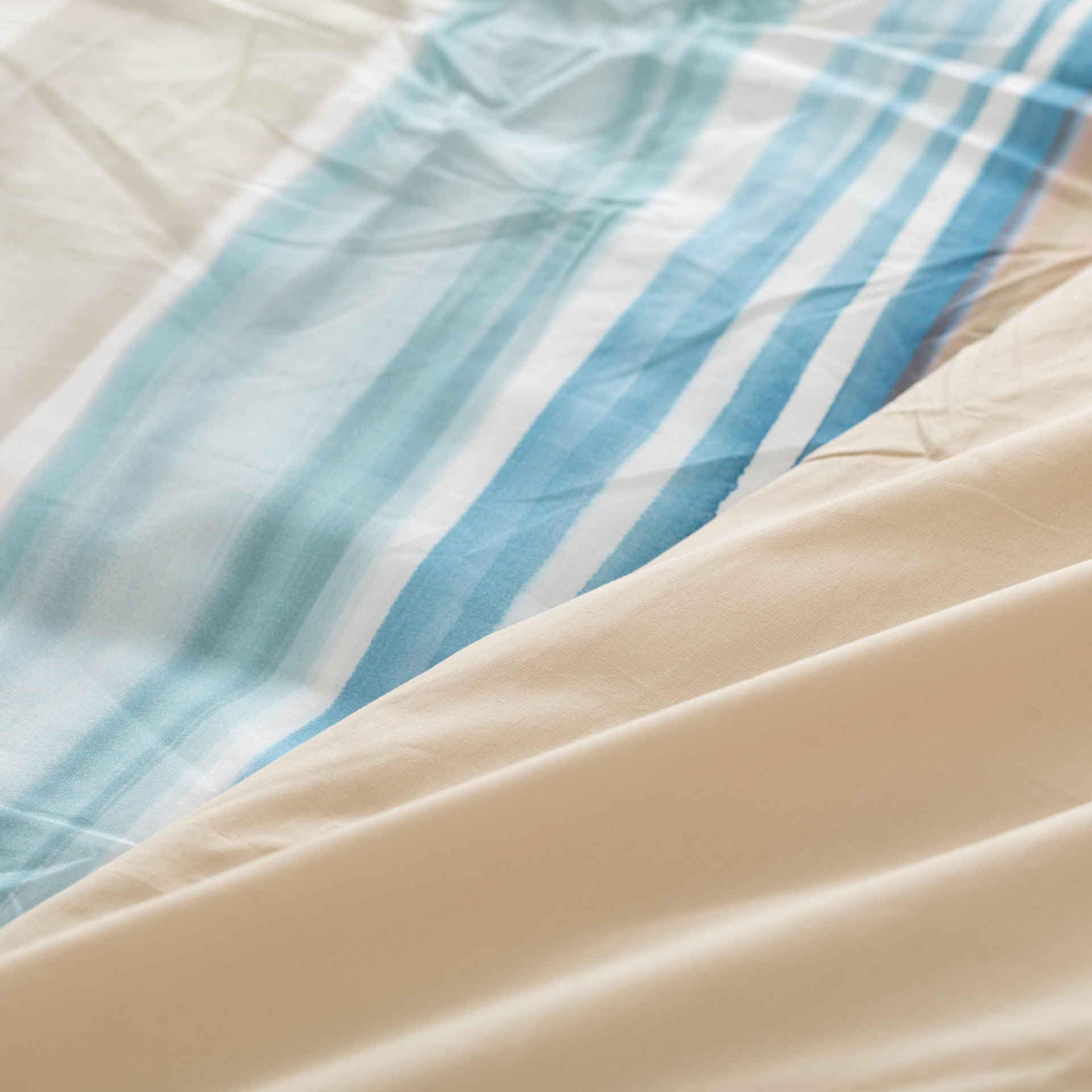 La parure copripiumino Lushana in percalle reinterpreta il motivo a righe in chiave contemporanea, con una stampa digitale su percalle 100% cotone che crea un effetto visivo morbido e armonioso. Le sfumature cromatiche scorrono leggere sul tessuto, portando movimento alla zona notte senza appesantire l’ambiente. Il sotto sacco e il retro delle federe in tinta unita completano il design con equilibrio, mentre la mano fresca e compatta del percalle assicura comfort e traspirabilità.