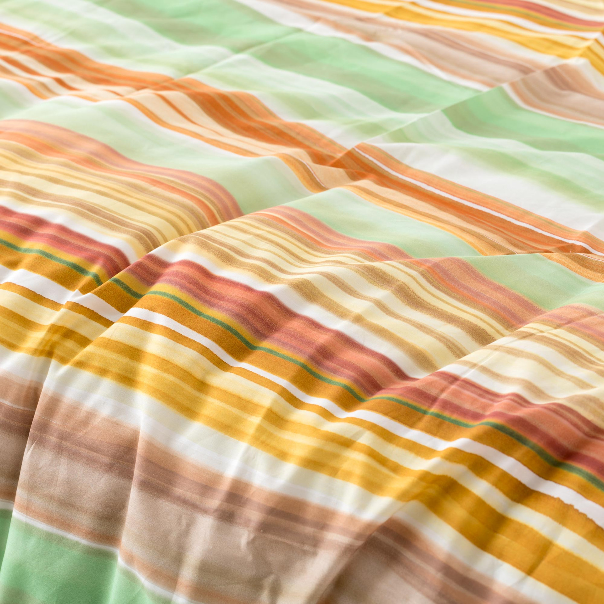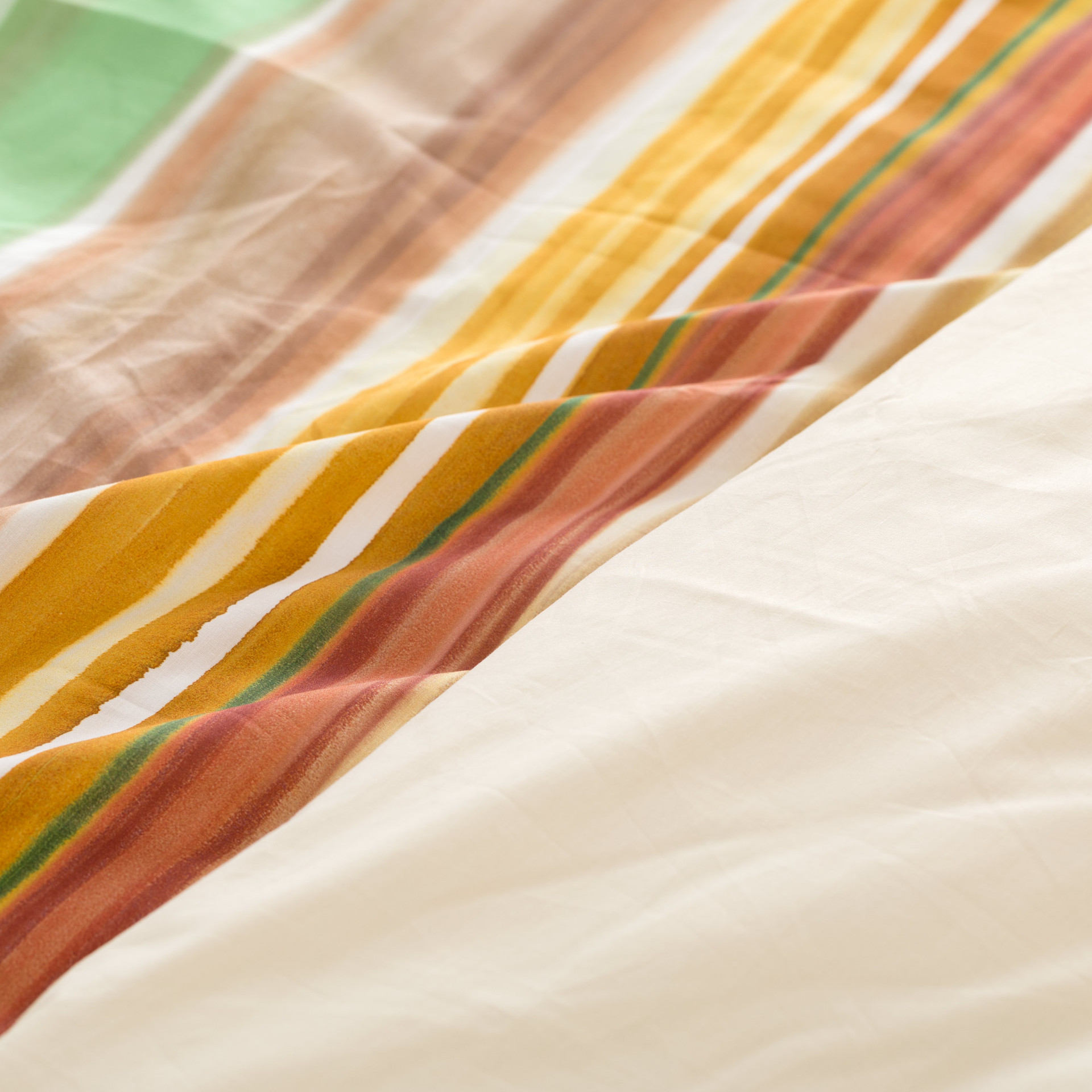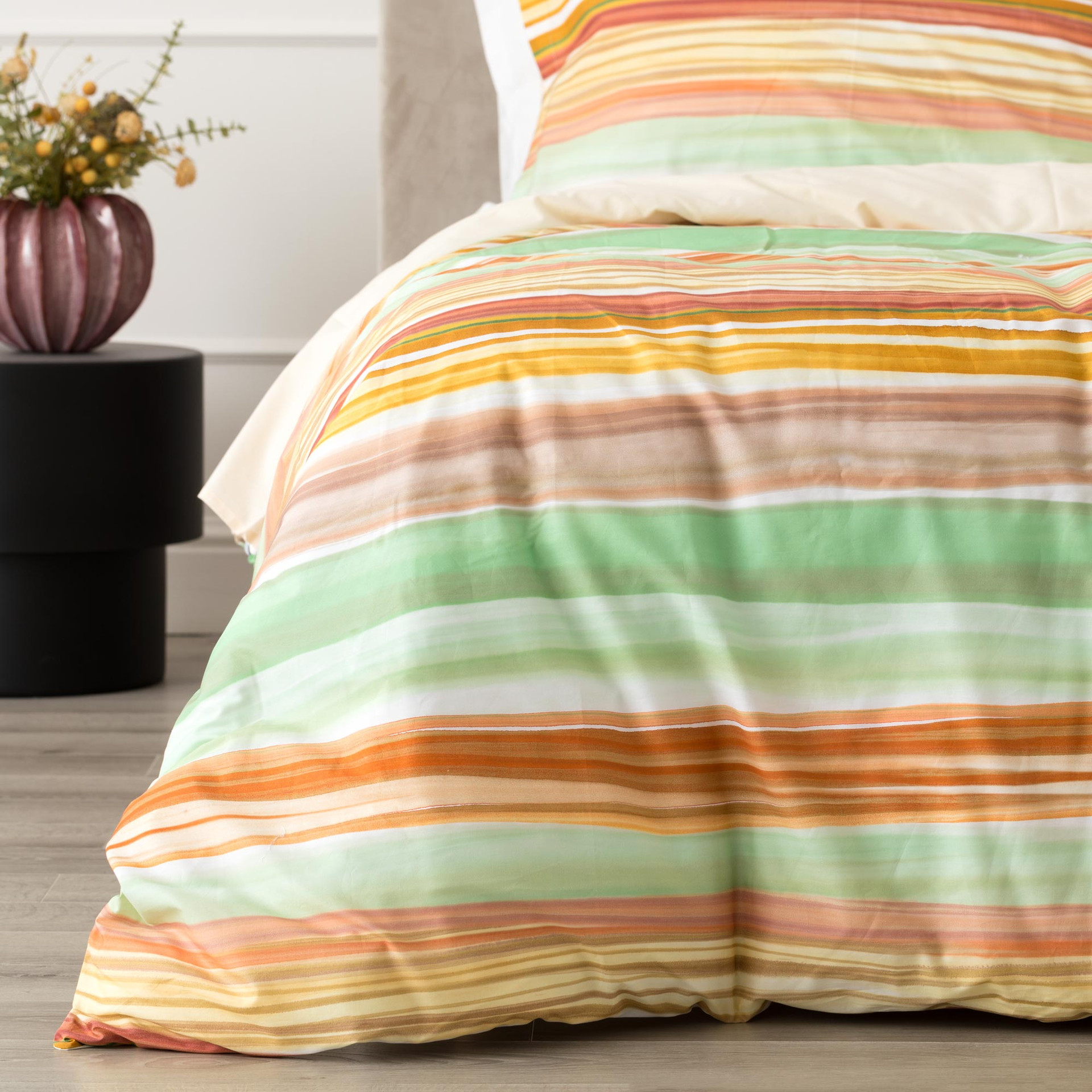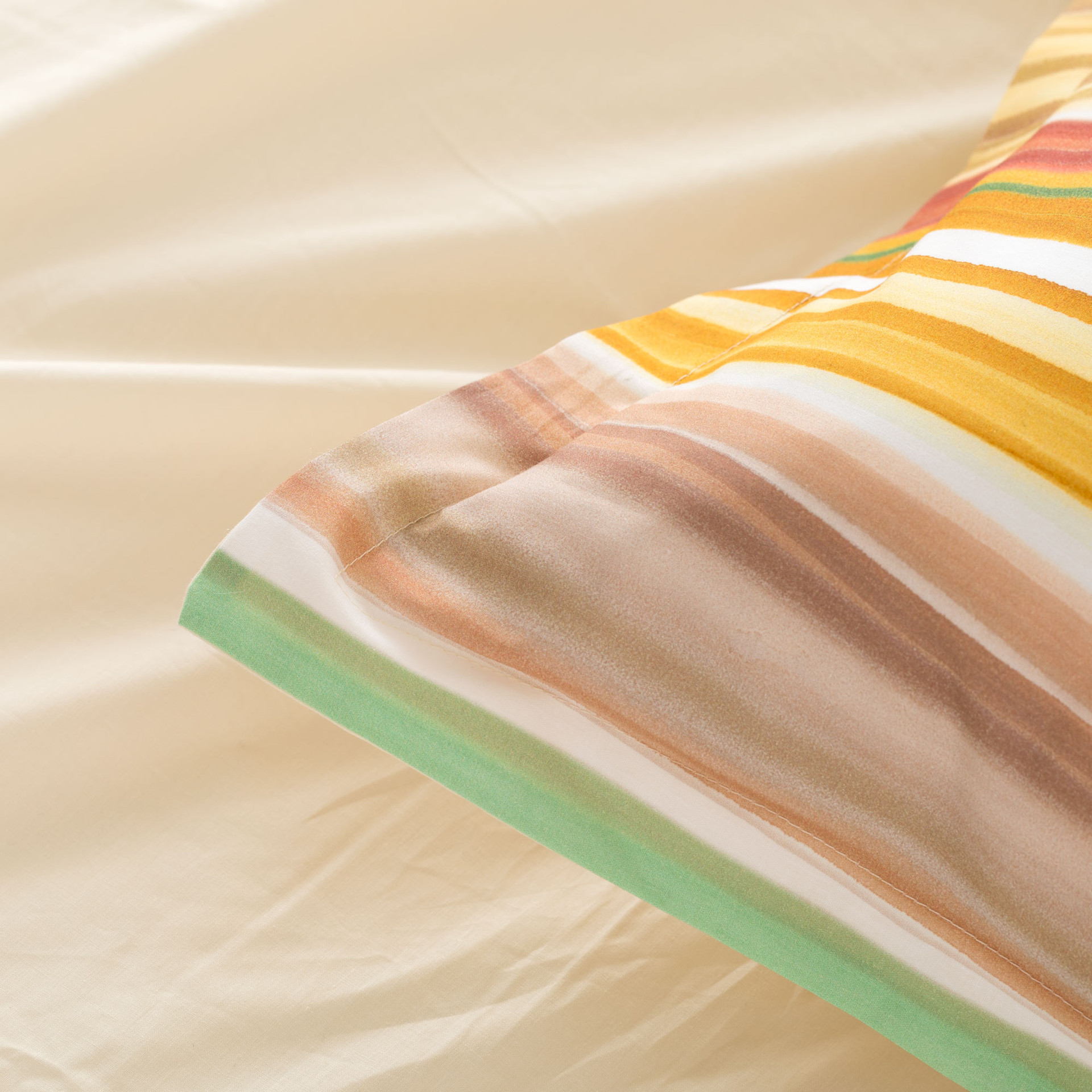La parure copripiumino Lushana in percalle reinterpreta il motivo a righe in chiave contemporanea, con una stampa digitale su percalle 100% cotone che crea un effetto visivo morbido e armonioso. Le sfumature cromatiche scorrono leggere sul tessuto, portando movimento alla zona notte senza appesantire l’ambiente. Il sotto sacco e il retro delle federe in tinta unita completano il design con equilibrio, mentre la mano fresca e compatta del percalle assicura comfort e traspirabilità.