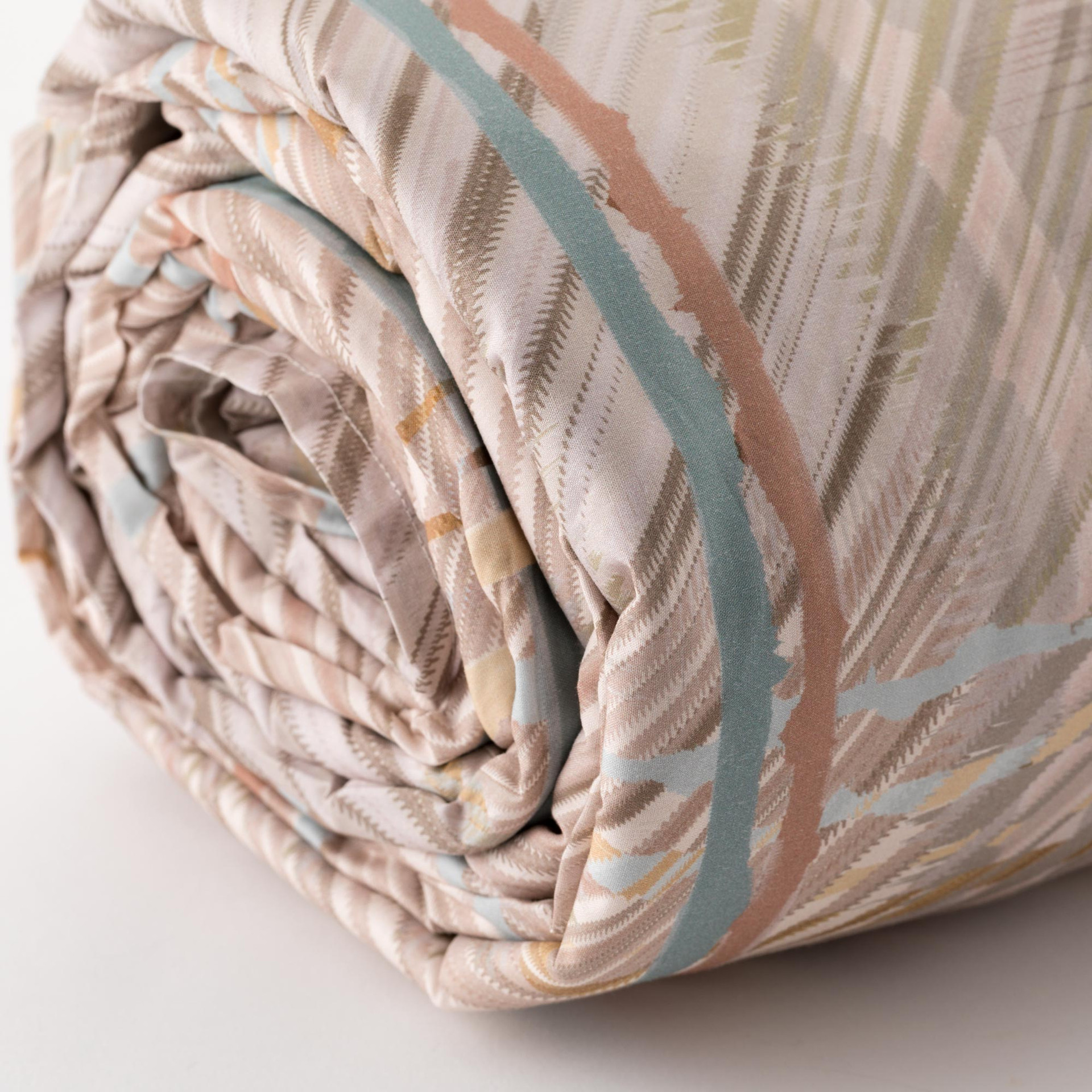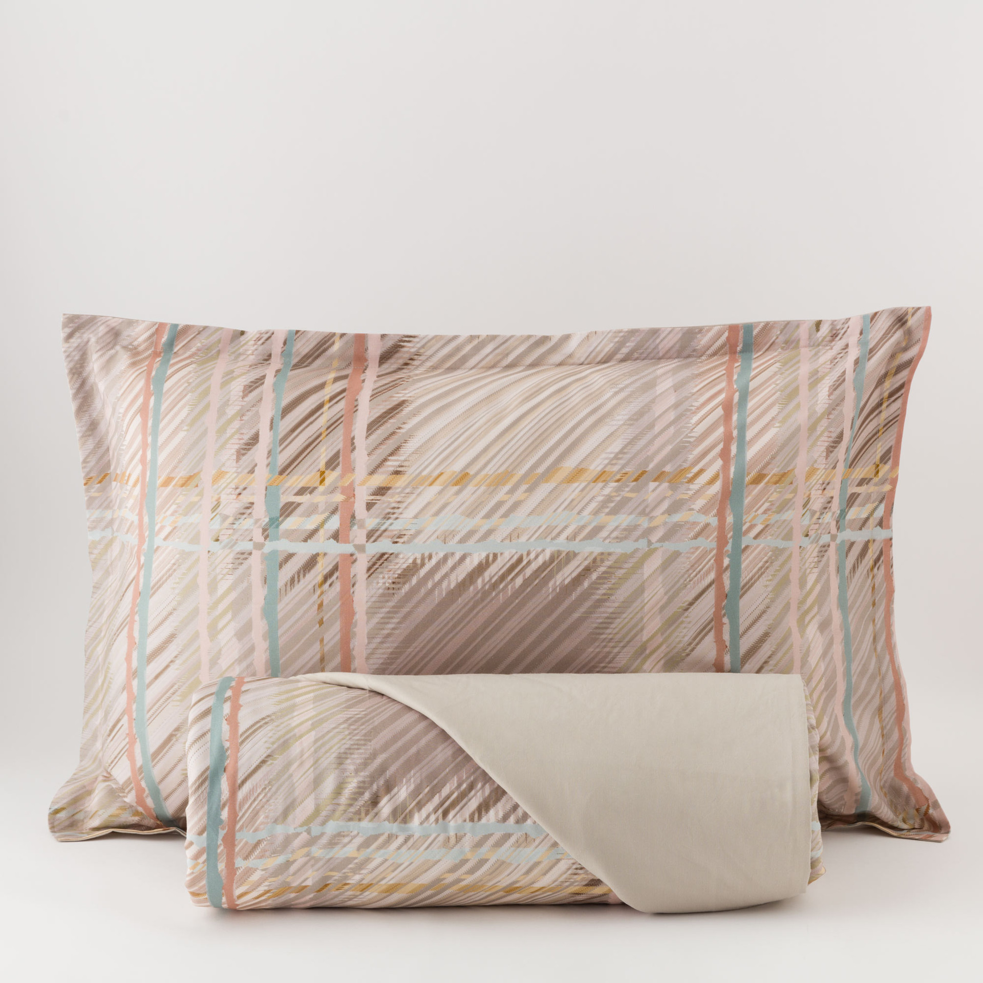 La parure copripiumino Yuta, in puro percalle di cotone, è pensata per portare nella zona notte una ventata di eleganza grafica e comfort naturale. Il design si basa su una stampa digitale ad alta risoluzione ispirata al tartan, qui rivisitato in chiave leggera e contemporanea. Le linee sottili, che si intersecano con ritmo delicato, conferiscono movimento al tessuto, creando una superficie visivamente dinamica ma al tempo stesso equilibrata.