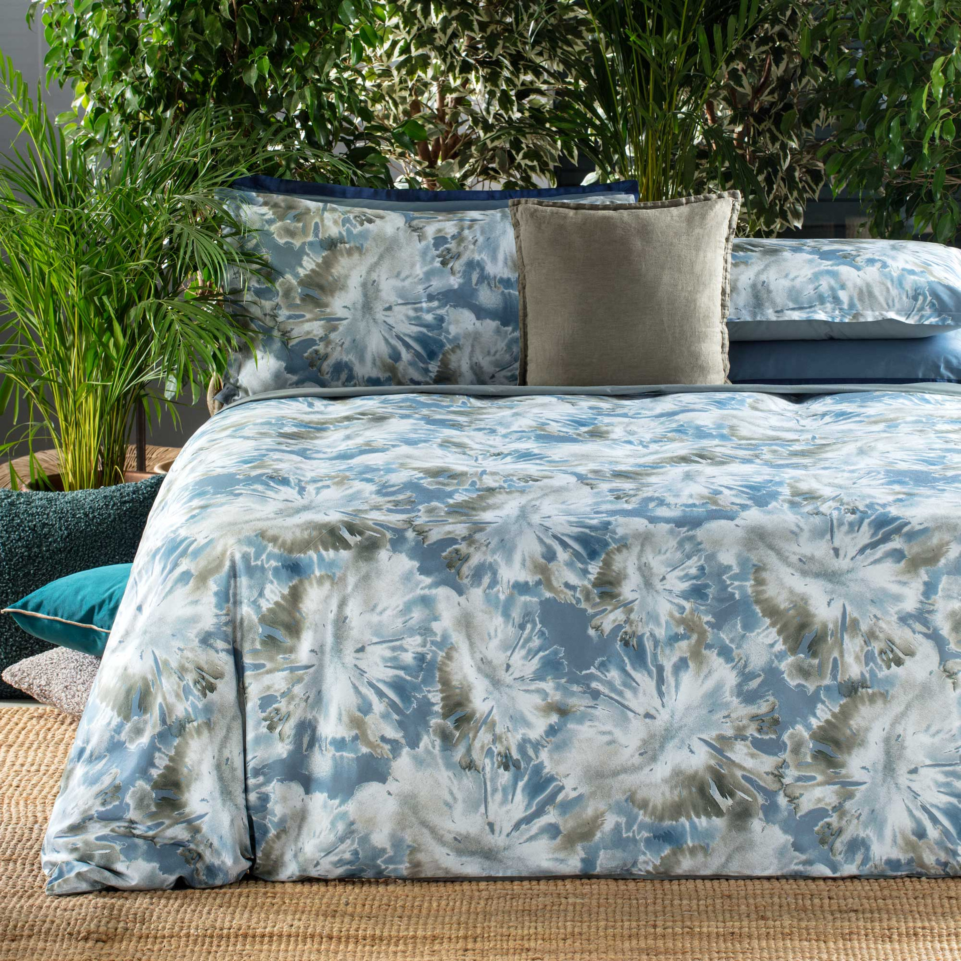 La parure Florian è un omaggio alla leggerezza della natura. I motivi floreali, resi vibranti dalla stampa digitale su raso di cotone 300 fili, si muovono come petali sospinti dal vento, creando un disegno che dona profondità e luce.