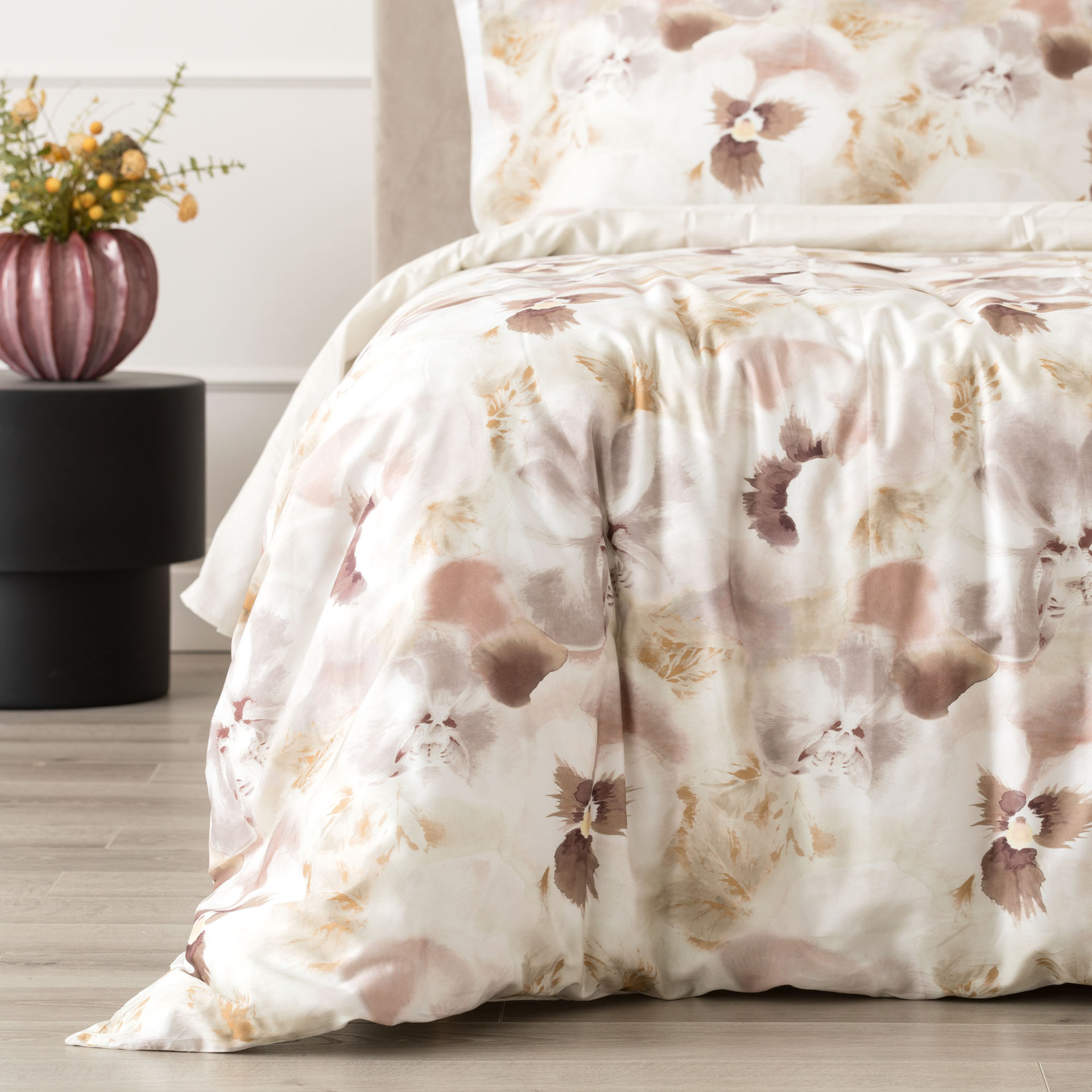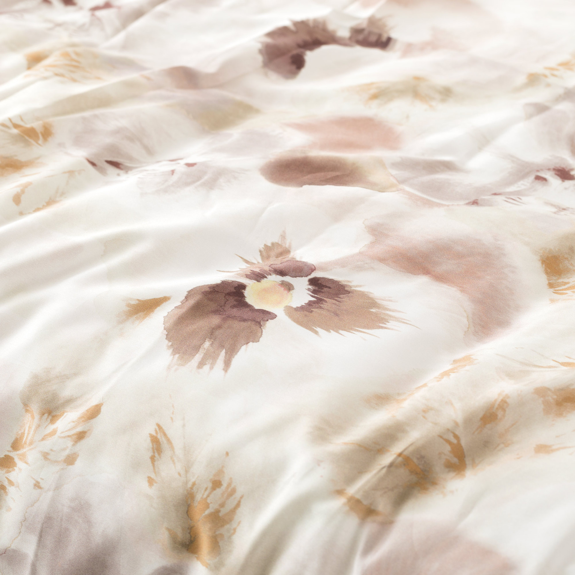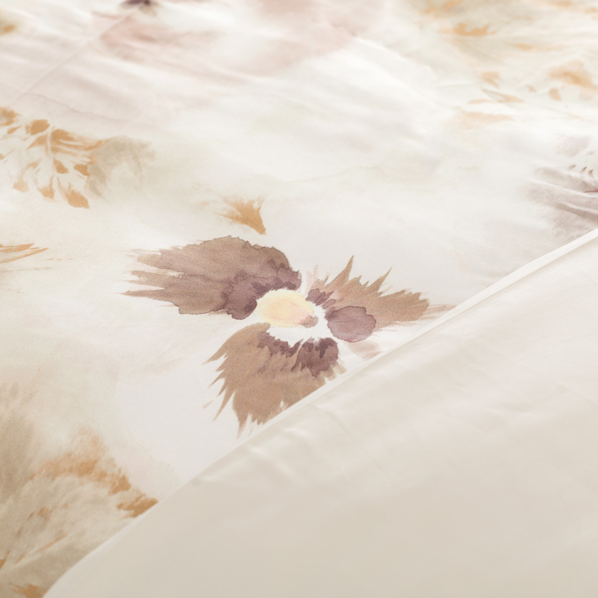 Il fronte in raso di cotone 300 fili accoglie una stampa digitale floreale dal tratto morbido e pittorico. I fiori, ampi e sfumati, sembrano dipinti ad acquerello: petali vellutati, contorni delicati, sovrapposizioni leggere che creano profondità senza appesantire. È una fantasia romantica, ma rivisitata in chiave contemporanea.