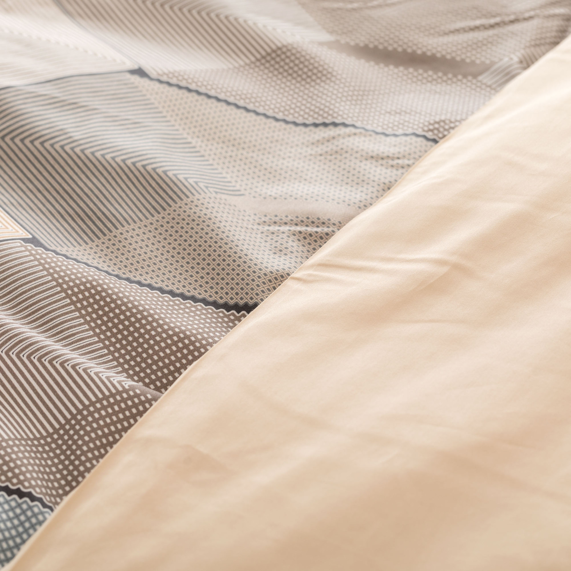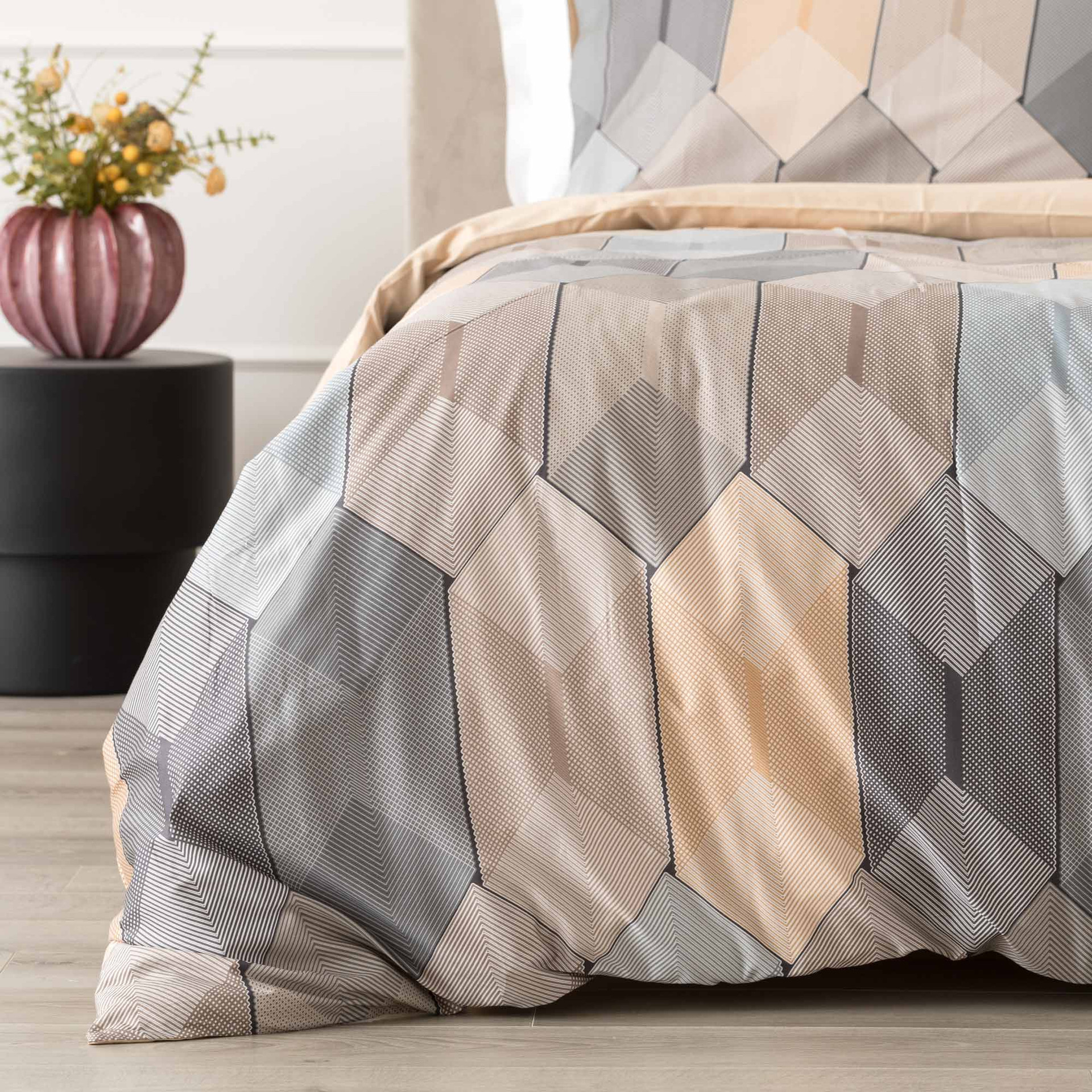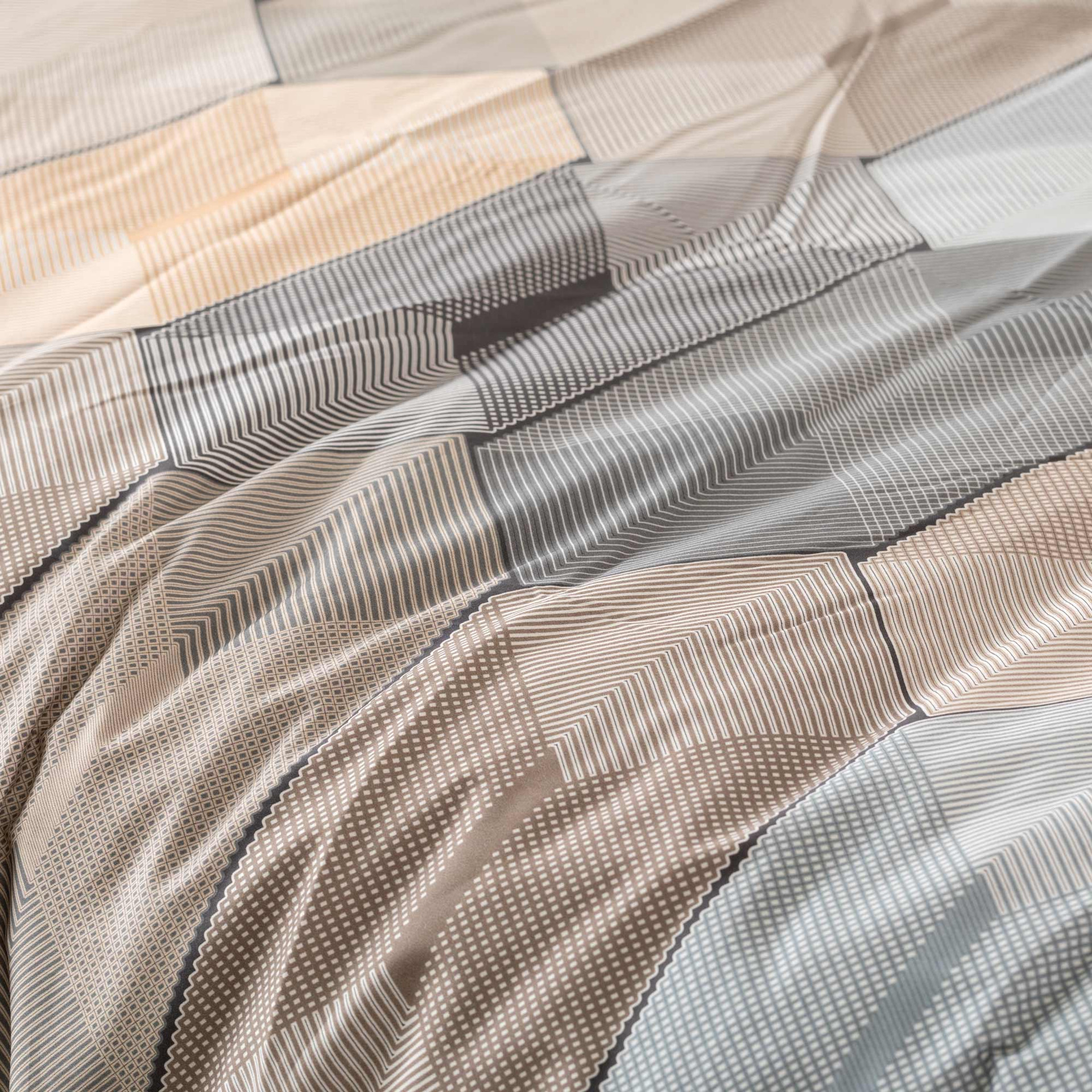 La parure copripiumino matrimoniale Diamante interpreta il letto come una superficie architettonica, fatta di geometrie, volumi e luce. Il disegno è costruito su una sequenza di moduli sfaccettati che ricordano un mosaico contemporaneo: forme irregolari, prospettive leggere, passaggi cromatici morbidi che creano profondità senza risultare rigidi.