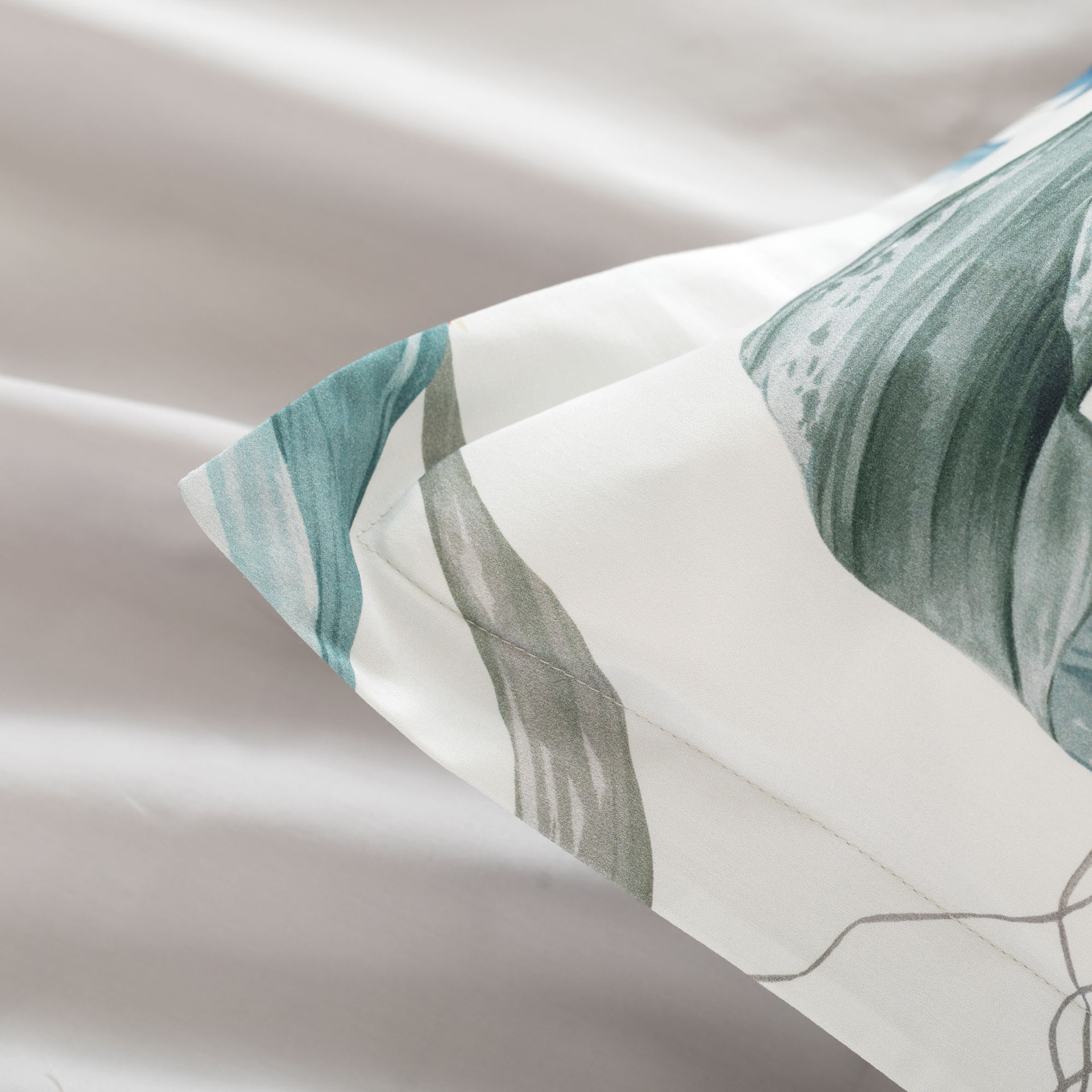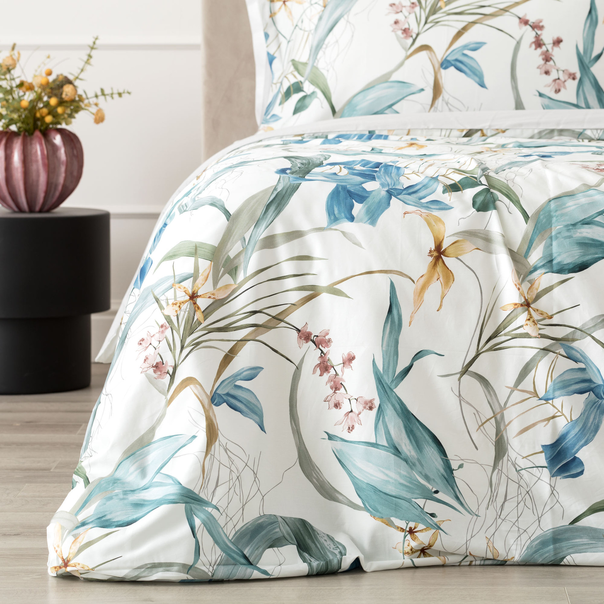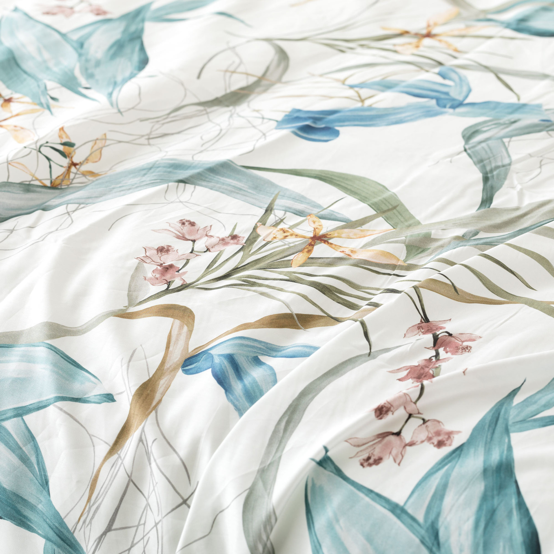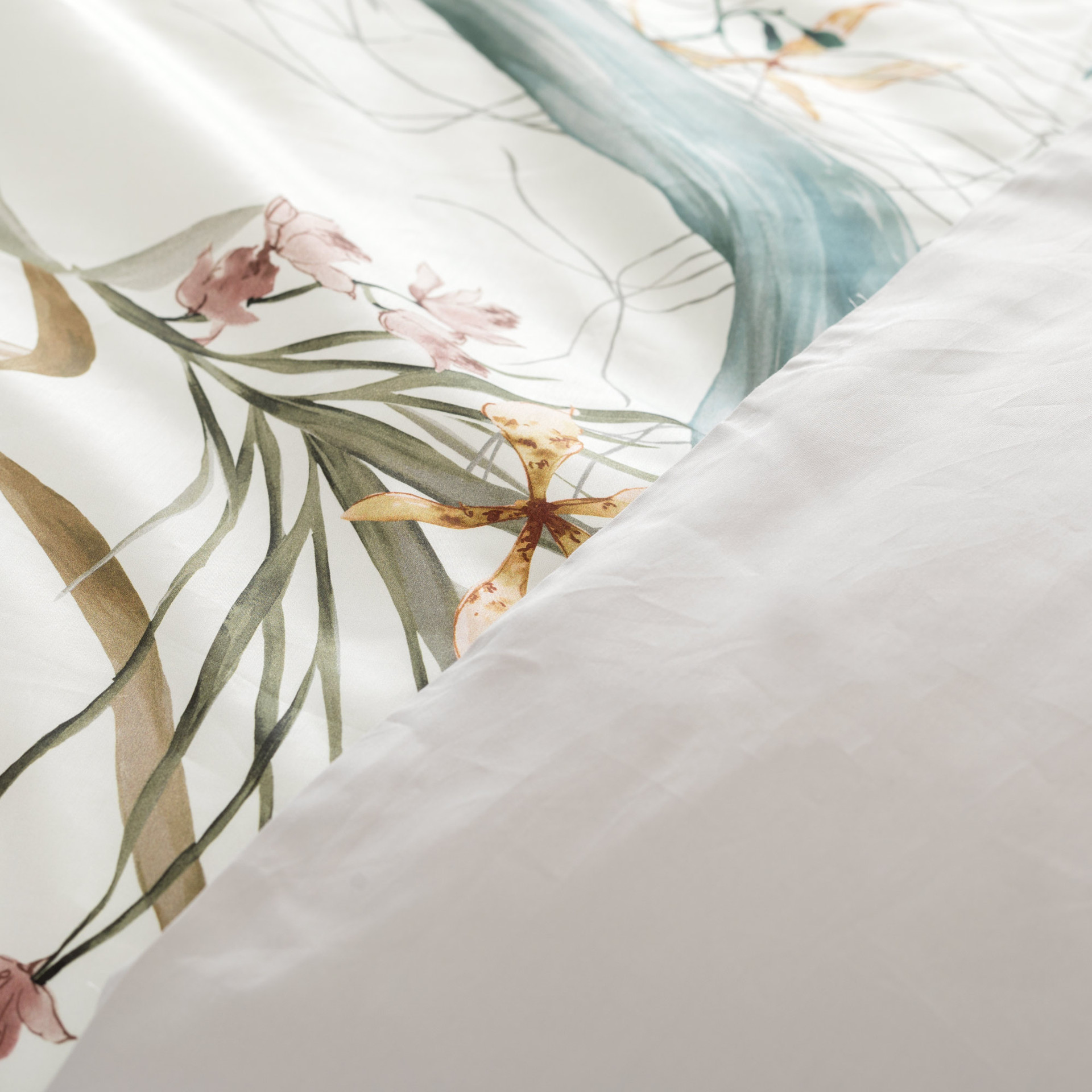 La parure copripiumino matrimoniale Preziosa veste il letto con una leggerezza luminosa, ispirata alla delicatezza del mondo botanico. Il raso di cotone 300 fili, liscio e naturalmente brillante, valorizza la stampa digitale rendendo ogni dettaglio nitido e profondo, come se fosse dipinto sul tessuto.