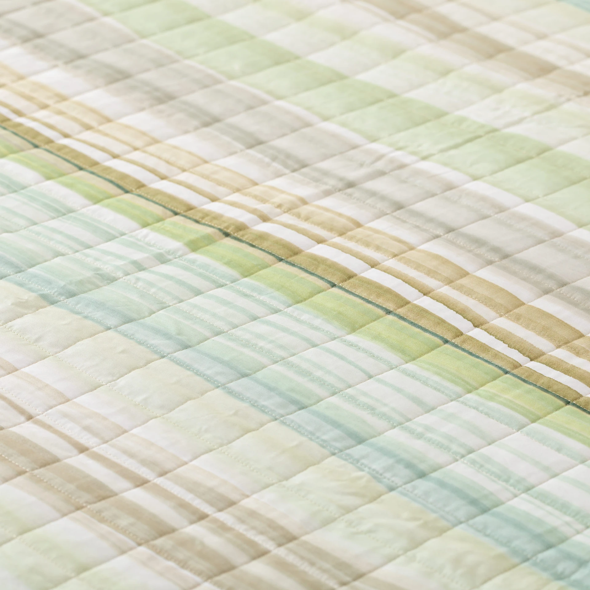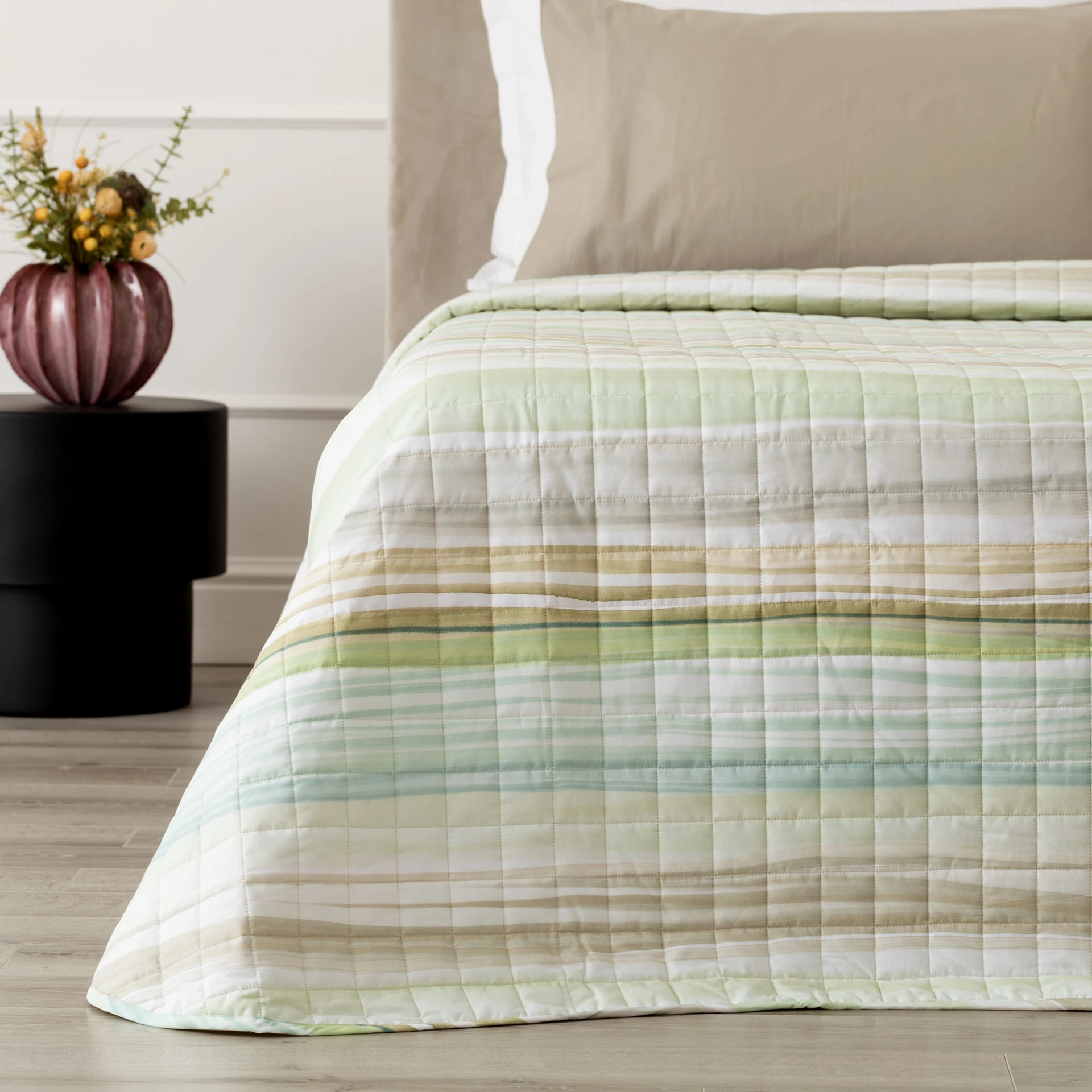 Il trapuntino matrimoniale Lushana interpreta lo stile rigato in chiave contemporanea, con una stampa digitale su percalle 100% cotone che alterna fasce cromatiche morbide e armoniose. Il disegno a righe, fluido e materico, porta movimento al letto senza risultare invasivo, mentre il retro in percalle tinta unita completa il look con equilibrio. La mano del tessuto è fresca e compatta, ideale per chi apprezza la qualità del cotone pettinato e un’estetica pulita ma ricercata.