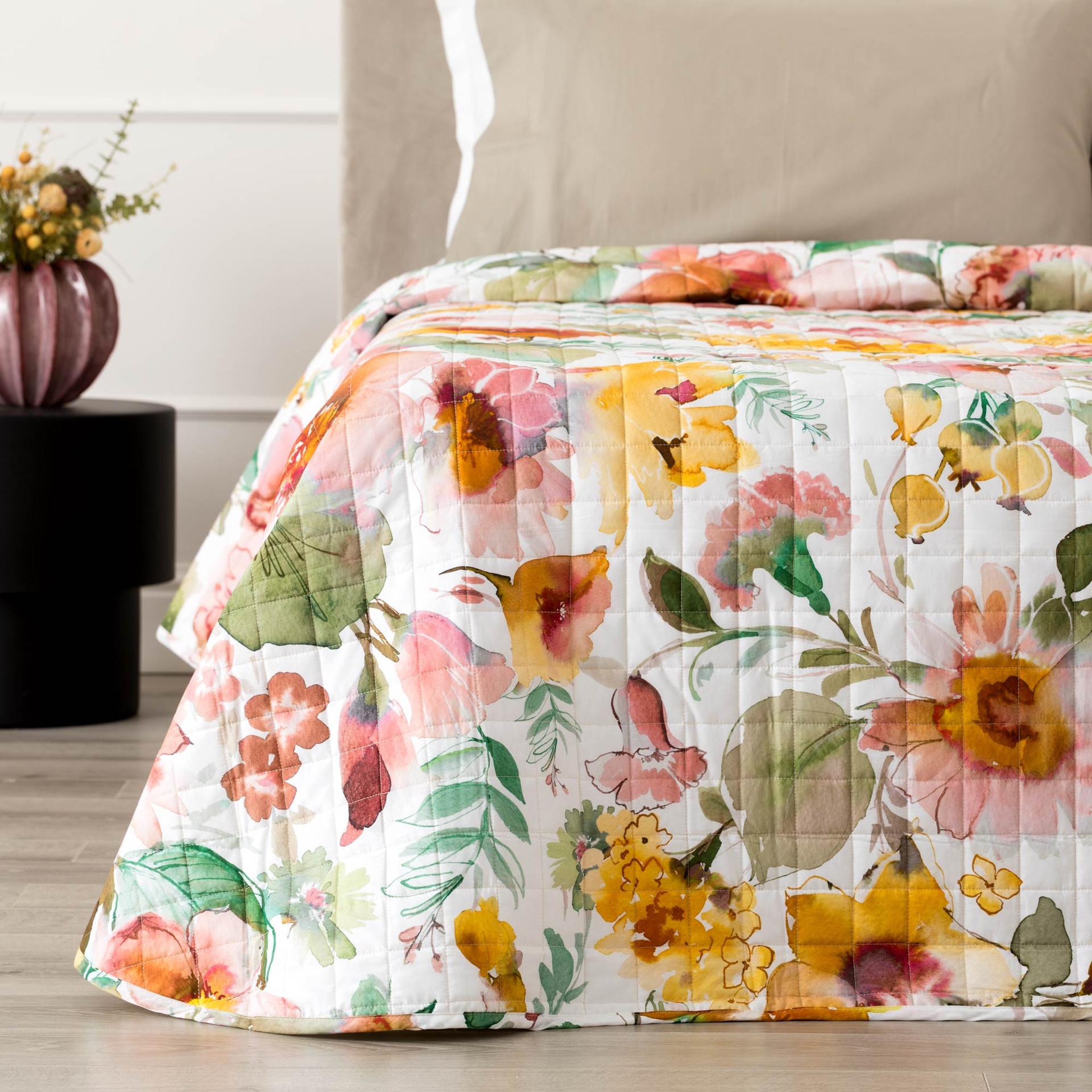 Il quilt matrimoniale Melika unisce estetica botanica contemporanea e comfort quotidiano grazie al fronte in percalle 100% cotone con stampa digitale, che valorizza il disegno floreale con colori profondi e dettagli definiti. Il retro in percalle tinta unita crea un elegante contrasto e rende il quilt versatile anche nell’uso a vista. La mano del tessuto è fresca e liscia, tipica del percalle di qualità, apprezzato nell’interior design per il suo equilibrio tra raffinatezza e praticità.