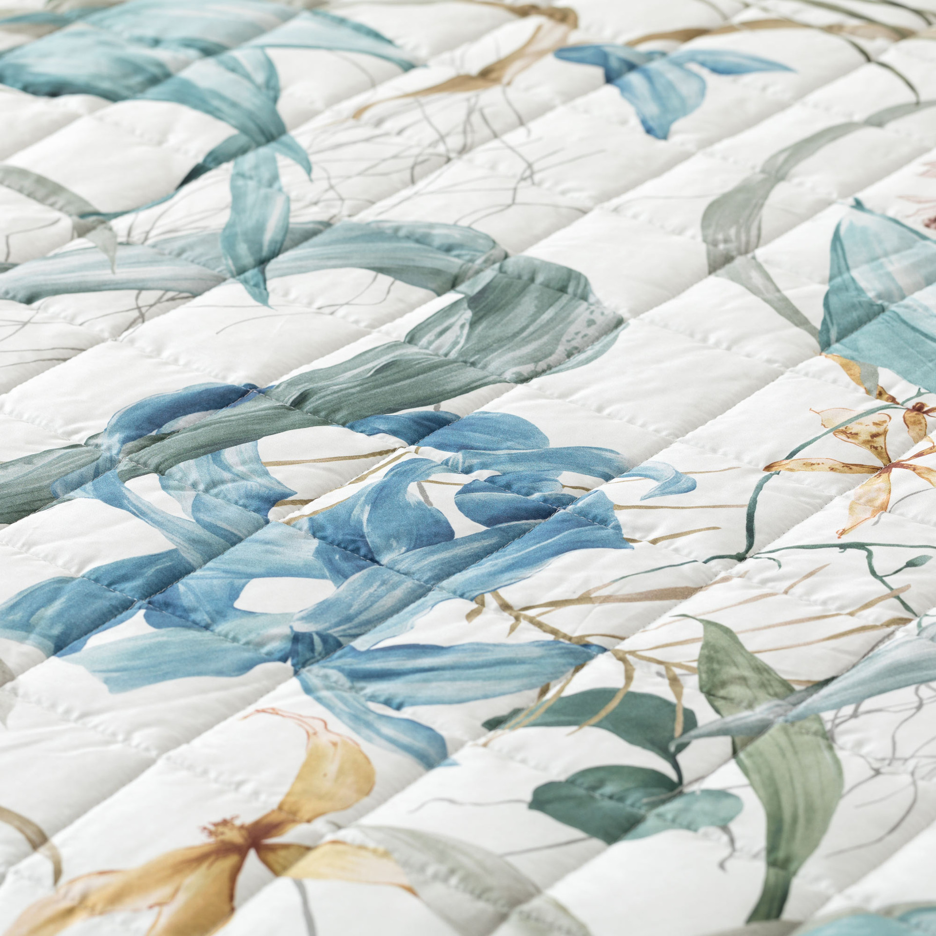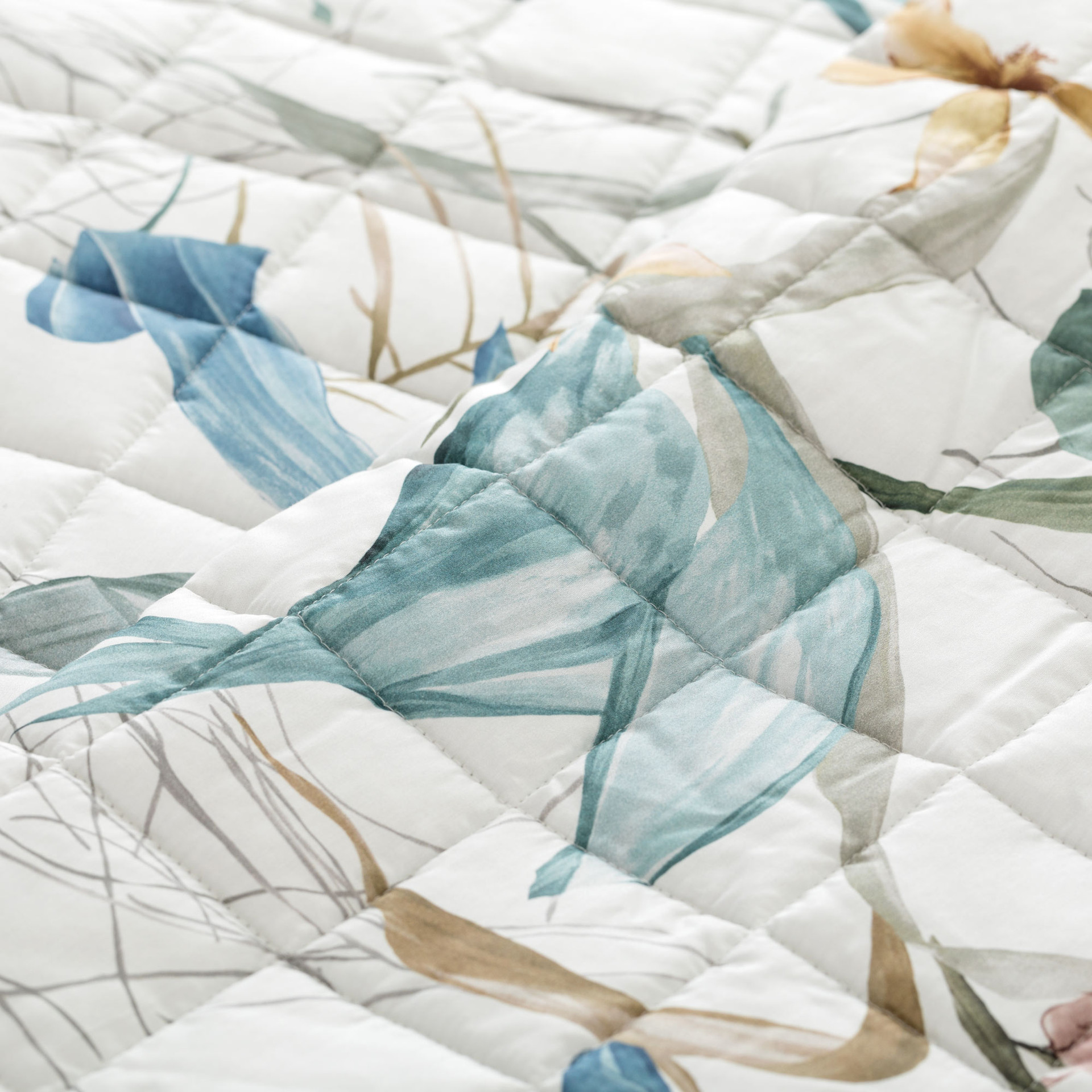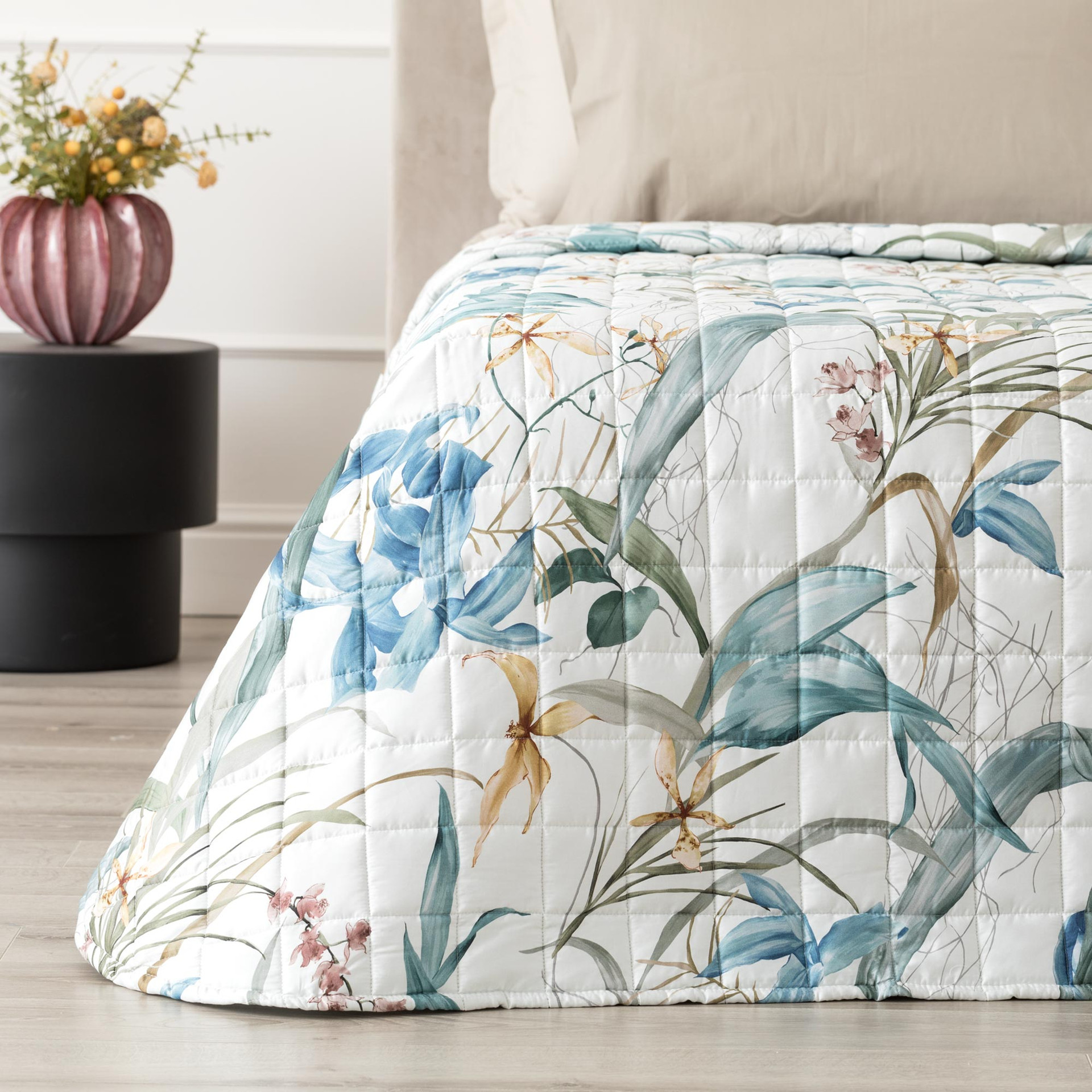 Il quilt matrimoniale Preziosa interpreta la fantasia floreale in chiave decorativa e contemporanea, con un disegno ispirato alla leggerezza della natura. La stampa digitale, resa luminosa dal raso di cotone 300 fili, mette in risalto rami sottili, foglie leggere e piccoli elementi botanici che sembrano muoversi sulla superficie, creando un effetto arioso e raffinato. Il disegno accompagna lo sguardo, dona ritmo al letto e aggiunge personalità senza appesantire.