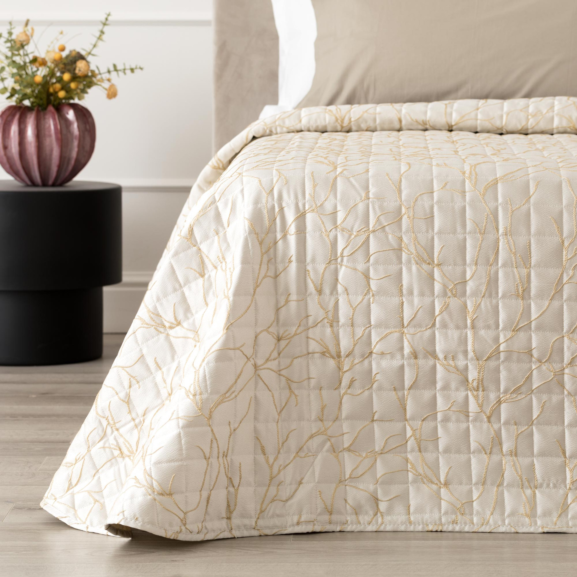 Il Quilt Jacquard Coraline è la scelta ideale per vestire la camera da letto con eleganza discreta e texture ricercate. La particolare lavorazione jacquard crea una raffinata fantasia effetto rametti, delicata e armoniosa, che dona profondità e carattere al tessuto. Disponibile nelle tonalità avorio, panna, tortora, turchese e rosa, si adatta con naturalezza a diversi stili di arredo.