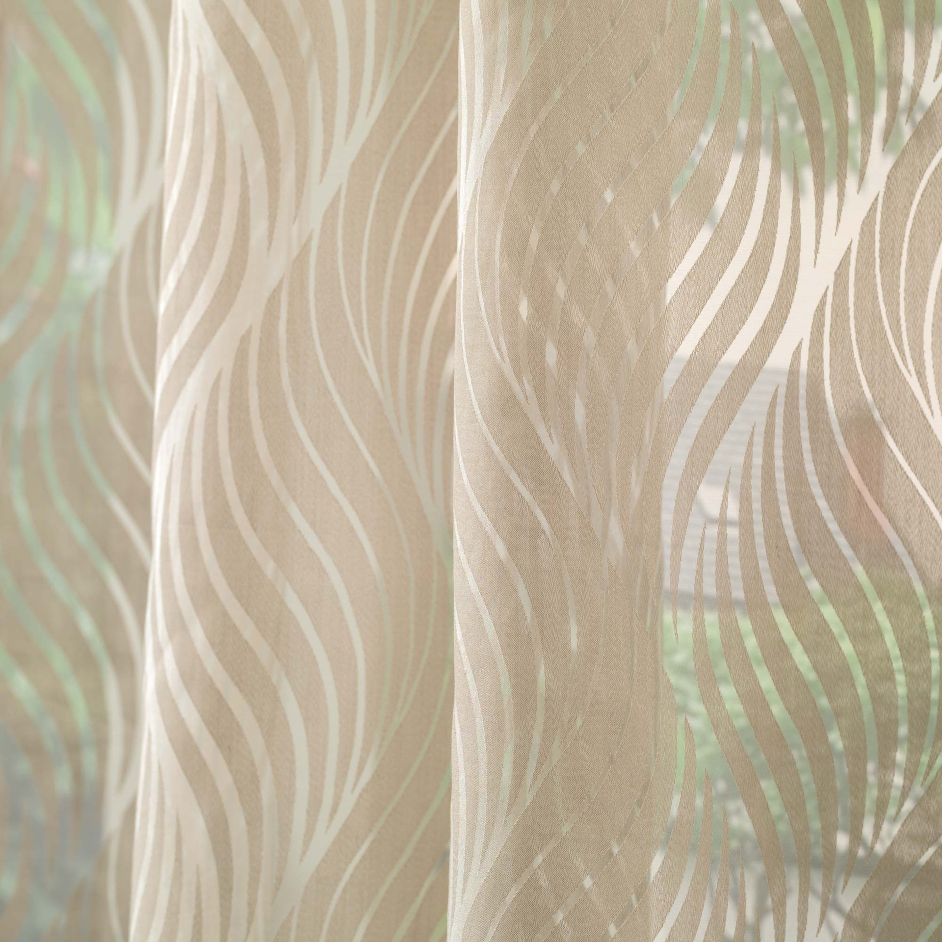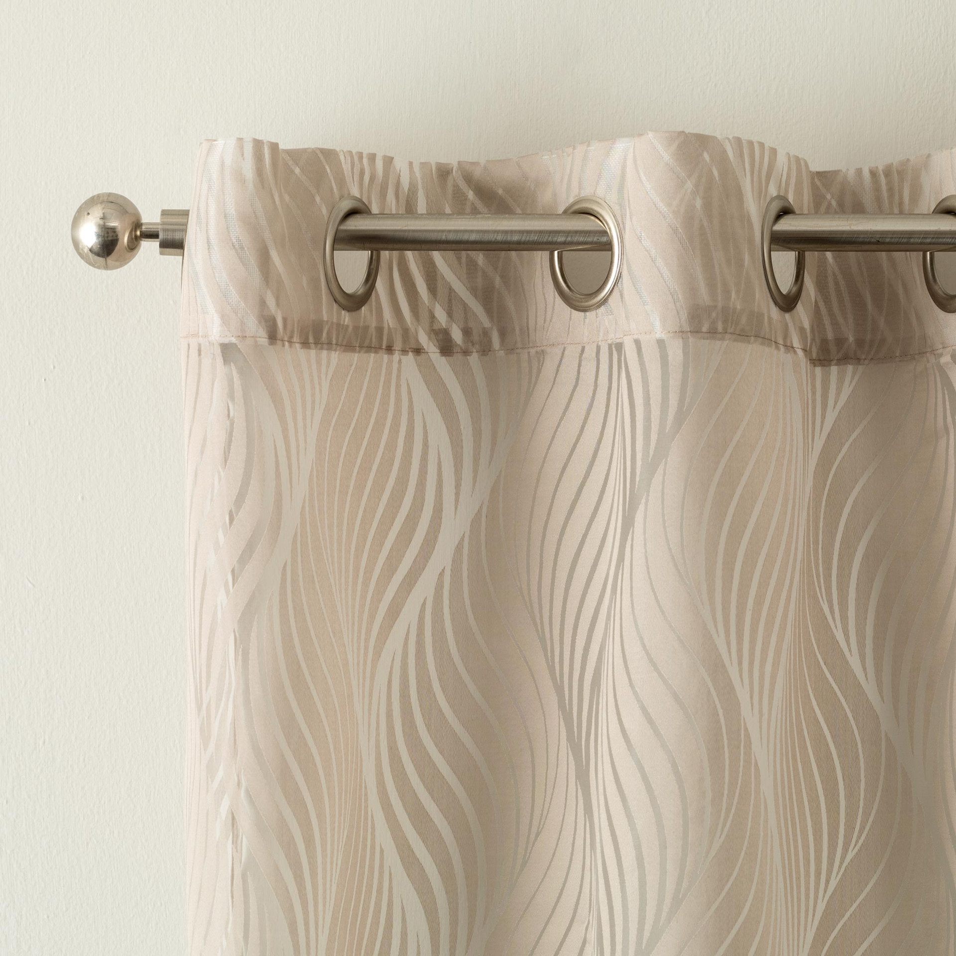 Tenda confezionata con borchie, tessuto semitrasparente. Finitura con piombo.
