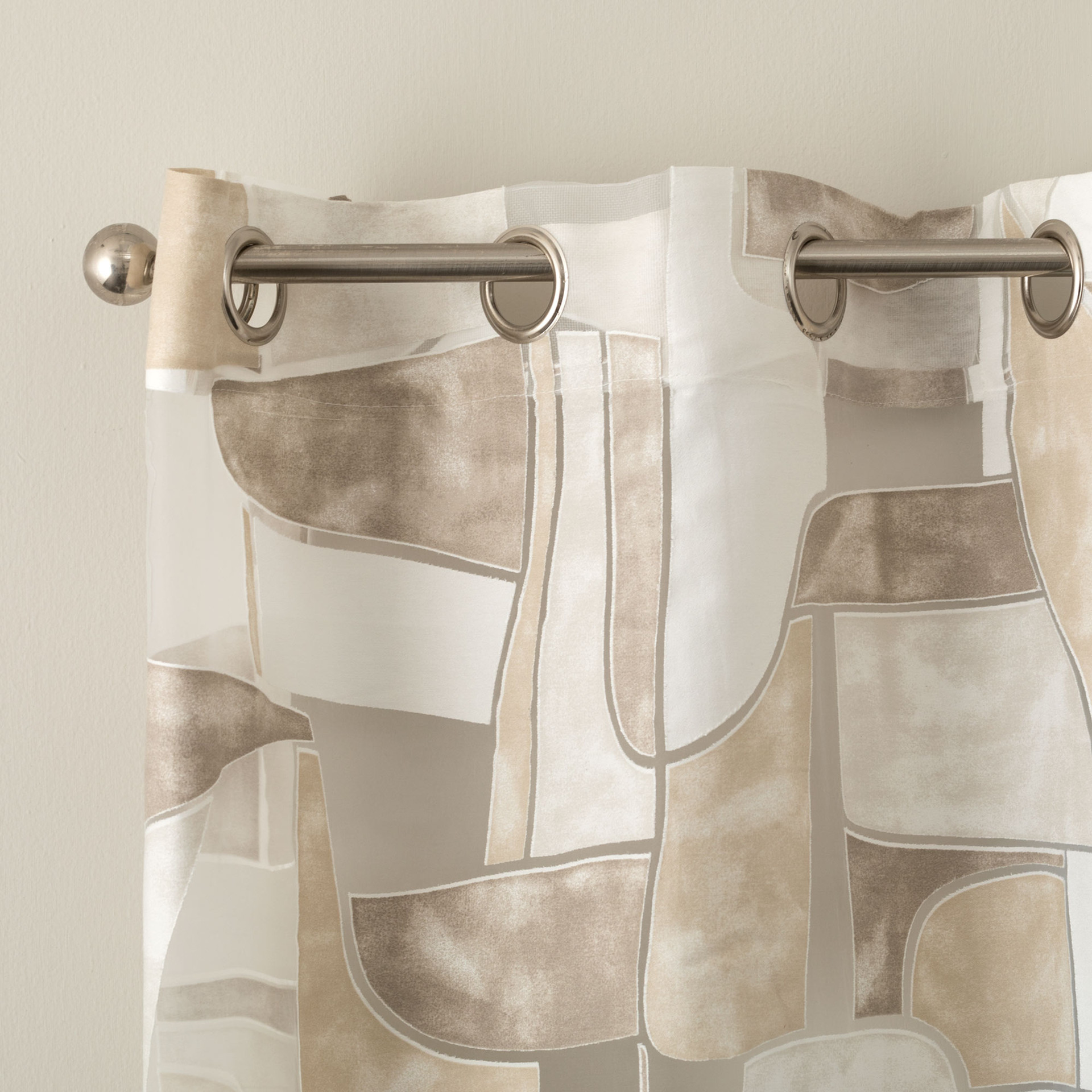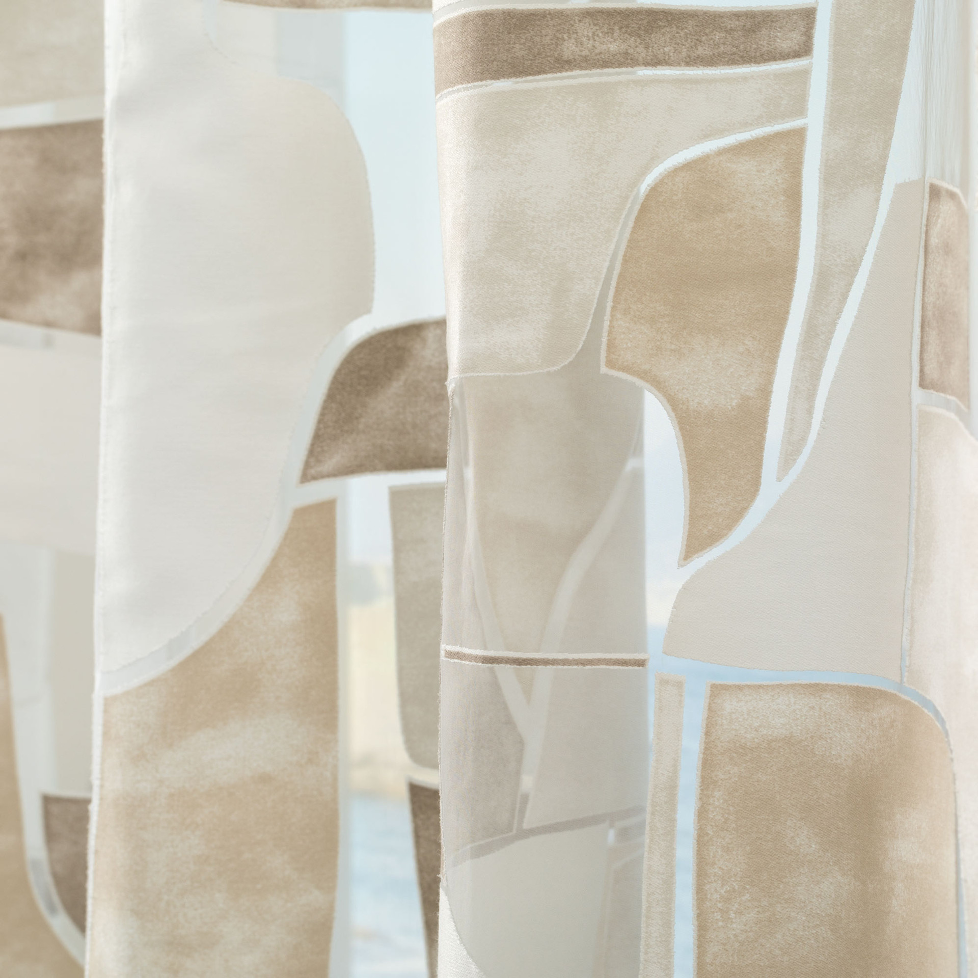 La confezione con borchie consente un’installazione pratica su bastoni per tende, assicurando una caduta regolare e armoniosa del pannello. La finitura con piombo applicata sul bordo inferiore mantiene il telo ben disteso e lineare, migliorandone la stabilità e garantendo un risultato estetico ordinato. Questo dettaglio tecnico contribuisce a esaltare l’effetto del tessuto devoré, valorizzandone la leggerezza e la resa visiva.