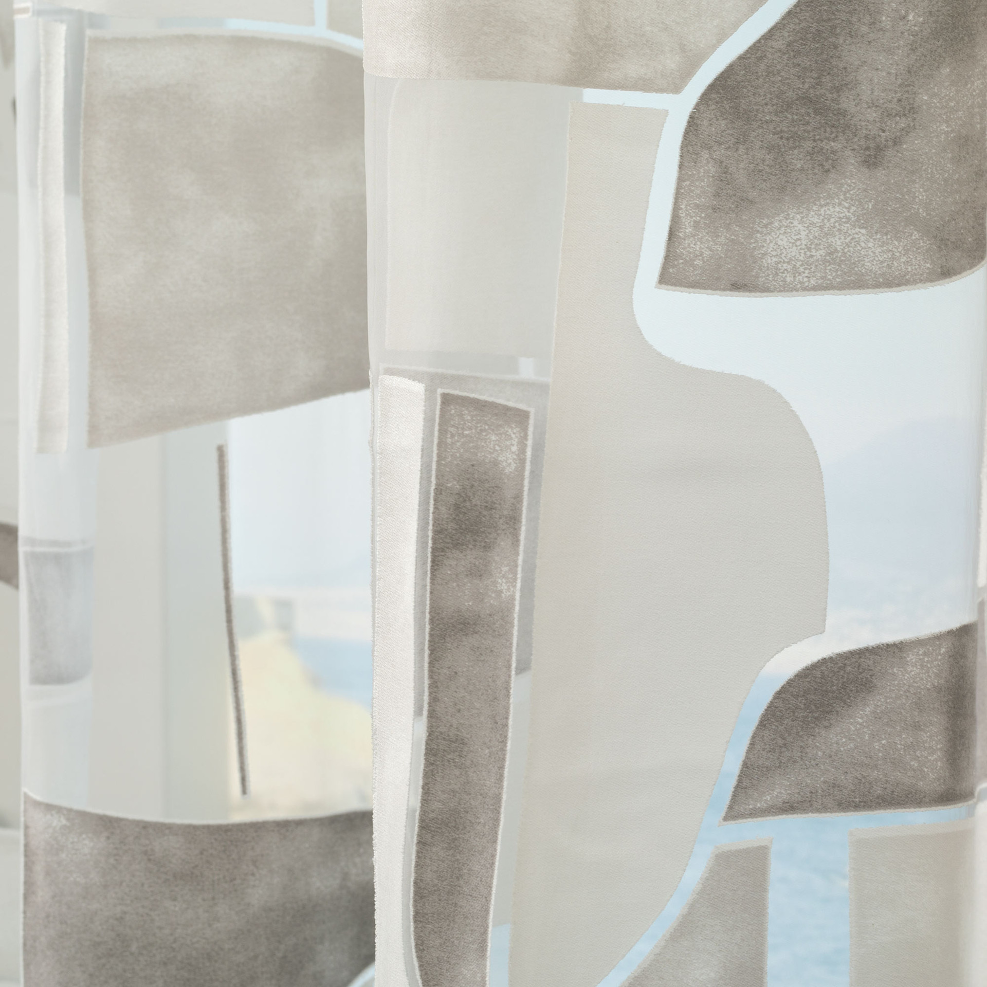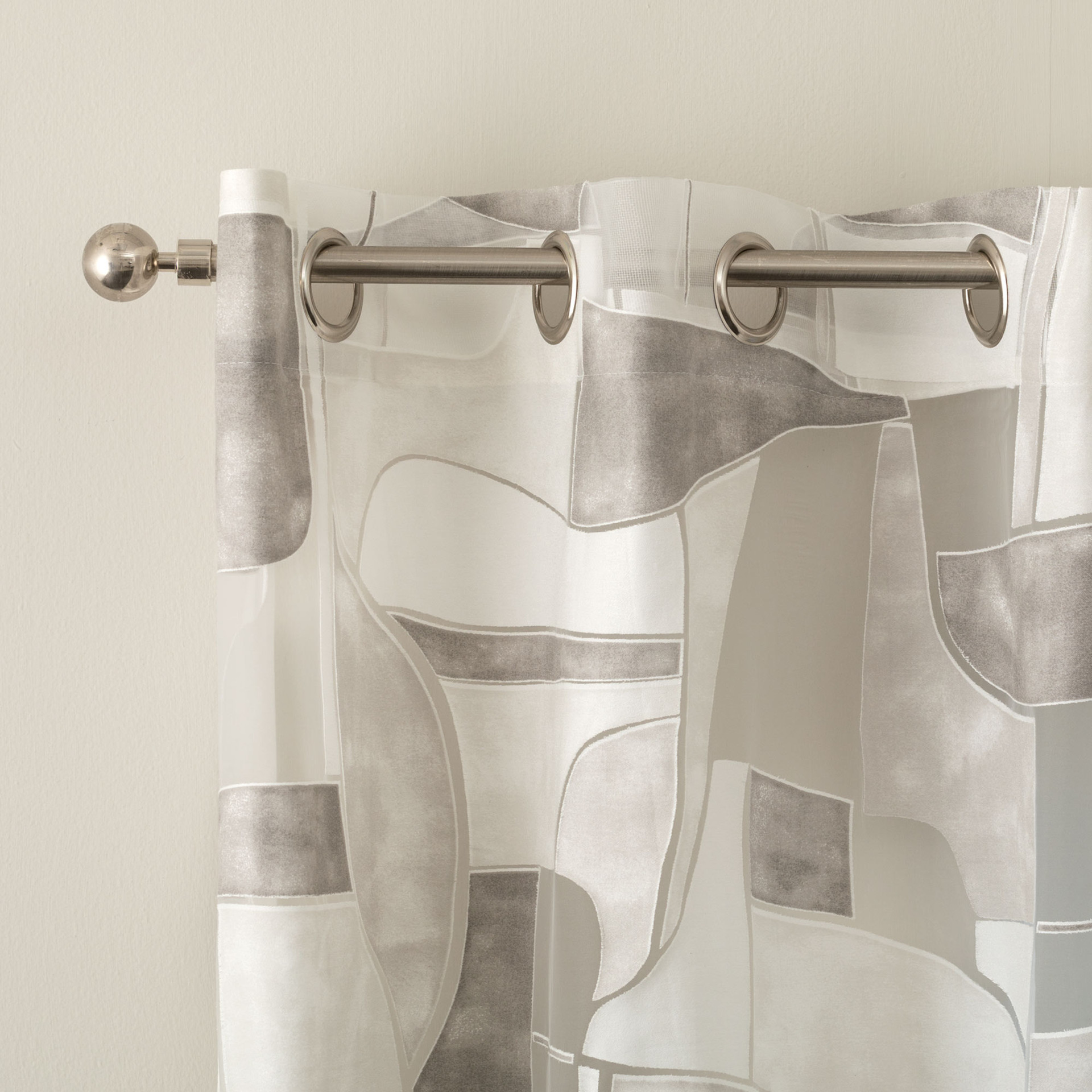 La confezione con borchie consente un’installazione pratica su bastoni per tende, assicurando una caduta regolare e armoniosa del pannello. La finitura con piombo applicata sul bordo inferiore mantiene il telo ben disteso e lineare, migliorandone la stabilità e garantendo un risultato estetico ordinato. Questo dettaglio tecnico contribuisce a esaltare l’effetto del tessuto devoré, valorizzandone la leggerezza e la resa visiva.