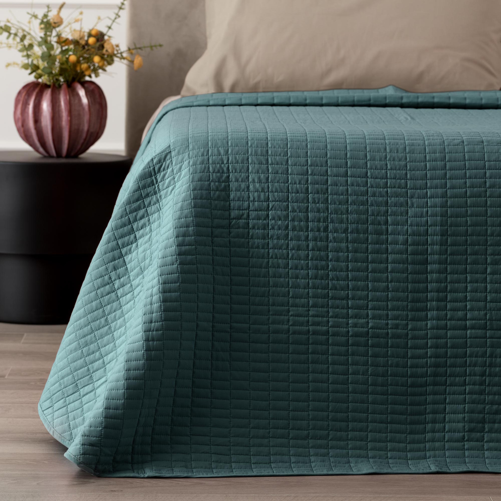 Dal punto di vista funzionale, questo quilt si distingue per la stabilità della trapuntatura, che mantiene l’imbottitura ben distribuita nel tempo evitando accumuli o spostamenti interni. Il tessuto presenta una mano liscia e compatta, resistente ai lavaggi frequenti e caratterizzato da un’asciugatura rapida, aspetto particolarmente apprezzato nella gestione domestica. Gli angoli tondi accompagnano con naturalezza la linea del letto, migliorando la caduta laterale e contribuendo a un effetto visivo pulito e armonioso.