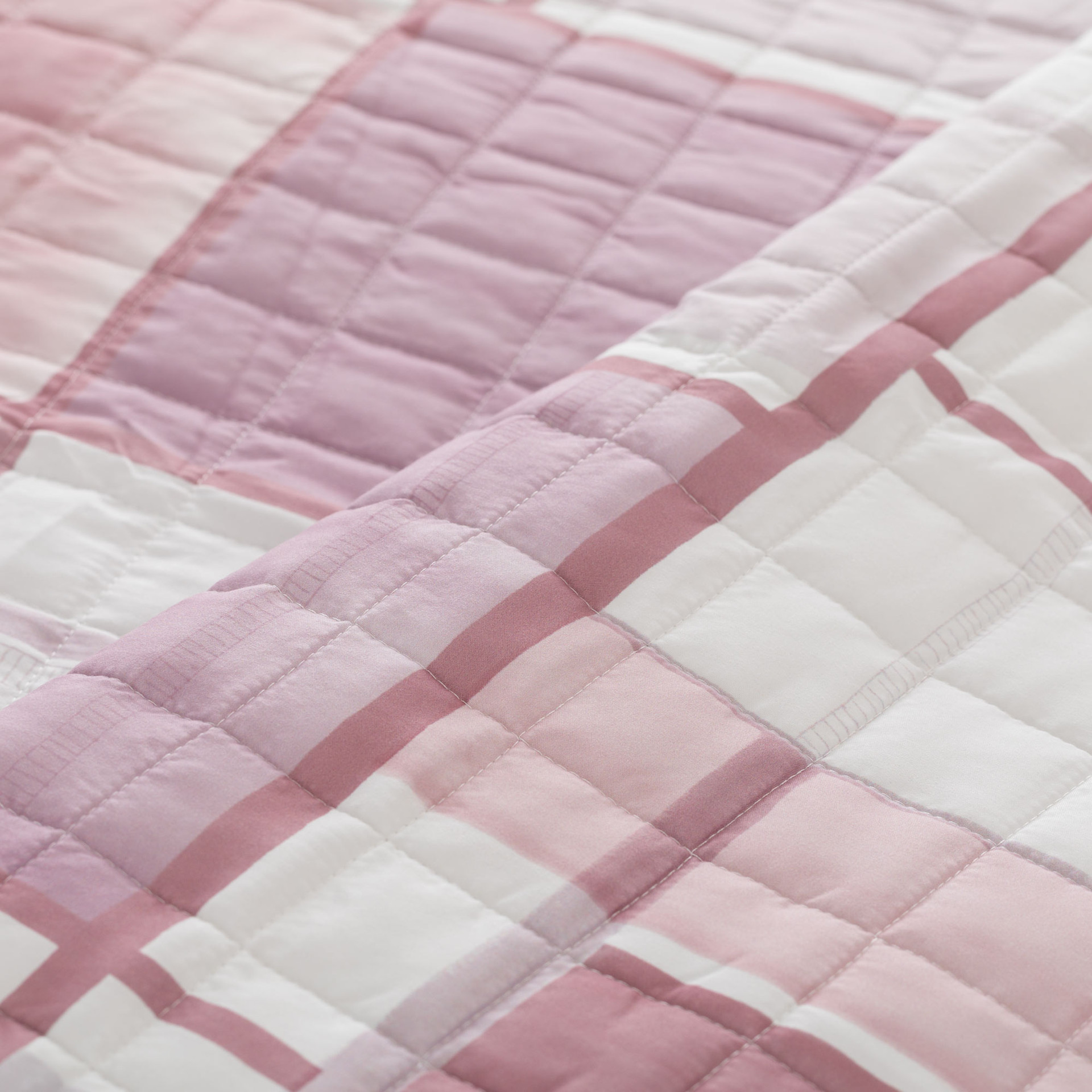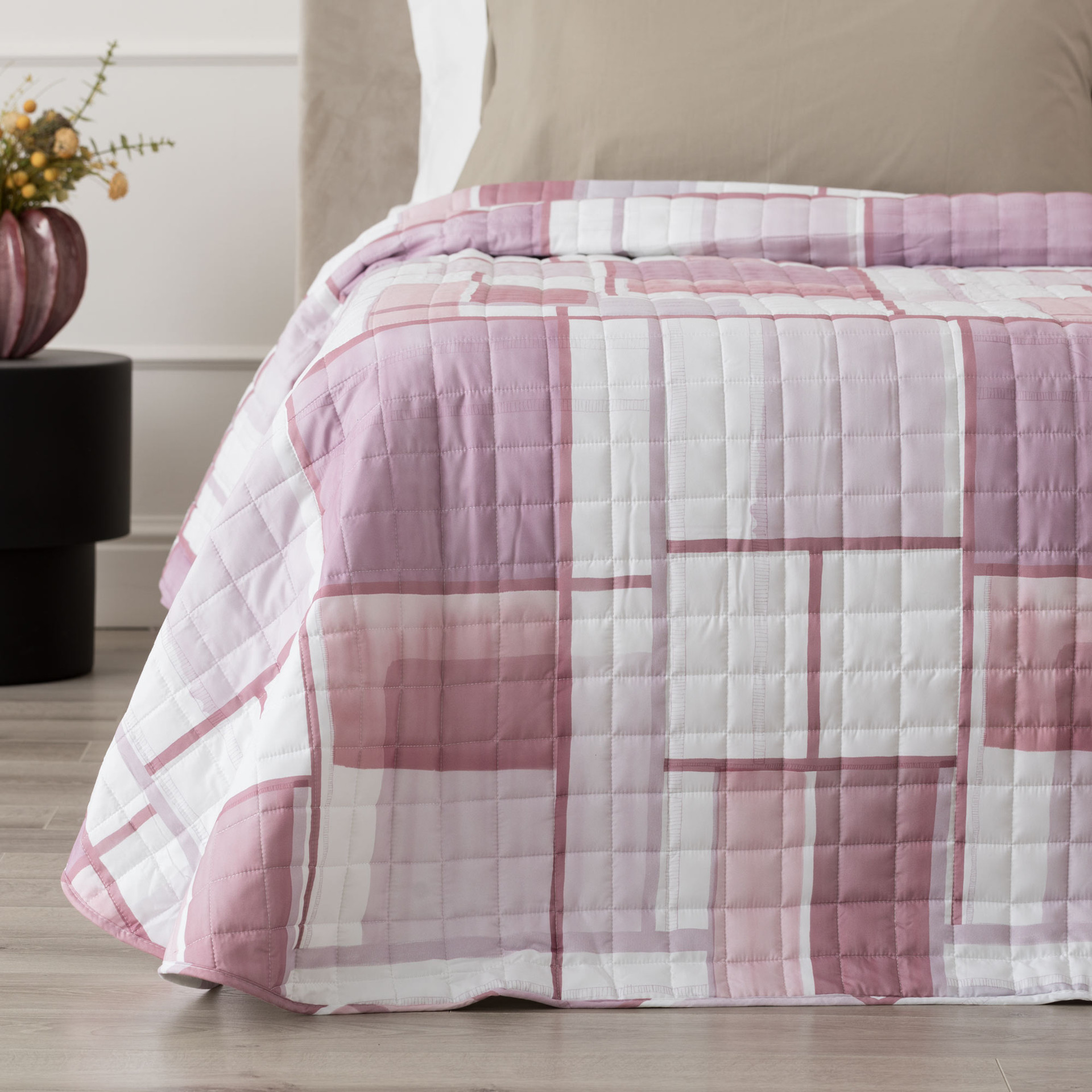 Juri quilt in microfibra a stampa digitale interpreta lo stile contemporaneo attraverso un disegno geometrico morbido e dinamico, fatto di sovrapposizioni cromatiche leggere che donano profondità al letto senza appesantire l’ambiente. Il motivo grafico, equilibrato e moderno, si integra facilmente sia in camere minimal sia in spazi più decorativi, portando una nota attuale e raffinata.