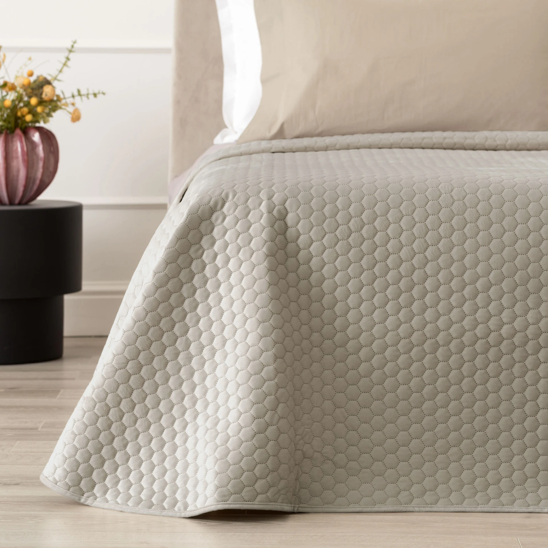 Dal punto di vista tattile, il velluto dona una mano morbida e leggermente vellutata, con una resa visiva uniforme che valorizza la luce e le sfumature del colore. La trapuntatura mantiene l’imbottitura stabile e ben distribuita, evitando spostamenti interni e garantendo una superficie sempre ordinata. Le dimensioni matrimoniali 260x260 cm assicurano una caduta ampia e proporzionata anche su letti con materassi più alti, contribuendo a un effetto finale armonioso e ben rifinito.