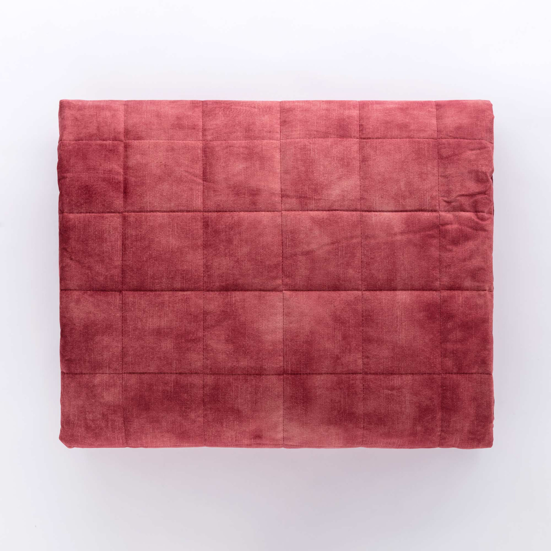 Trapuntino Goodly in velluto. Disponibile in bianco antico, giallo ambra, carta da zucchero, verde oliva, grigio nube, bordeaux, marrone moka. La foto emozionale si riferisce alla variante bordeaux amaranto. Il trapuntino ha un'imbottitura di 100gr, tessuto esterno fronte in velluto e retro in cotone. Trapuntatura a quadri - 2 angoli tondi.