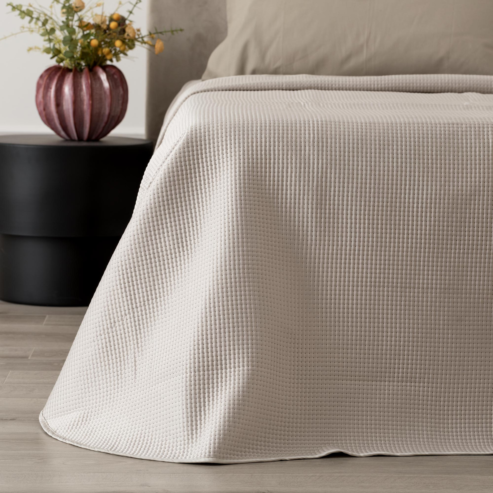 Il Quilt Capri matrimoniale è un trapuntino leggero dallo stile essenziale, pensato per chi desidera un letto ordinato e contemporaneo senza rinunciare alla praticità. Realizzato con esterno in 100% poliestere e imbottitura in poliestere da 100 gsm, offre una copertura ideale per la mezza stagione o per camere ben temperate. La lavorazione termosaldata satin crea una superficie uniforme e compatta, con una texture discreta che dona profondità visiva al letto mantenendo un’estetica pulita e raffinata.