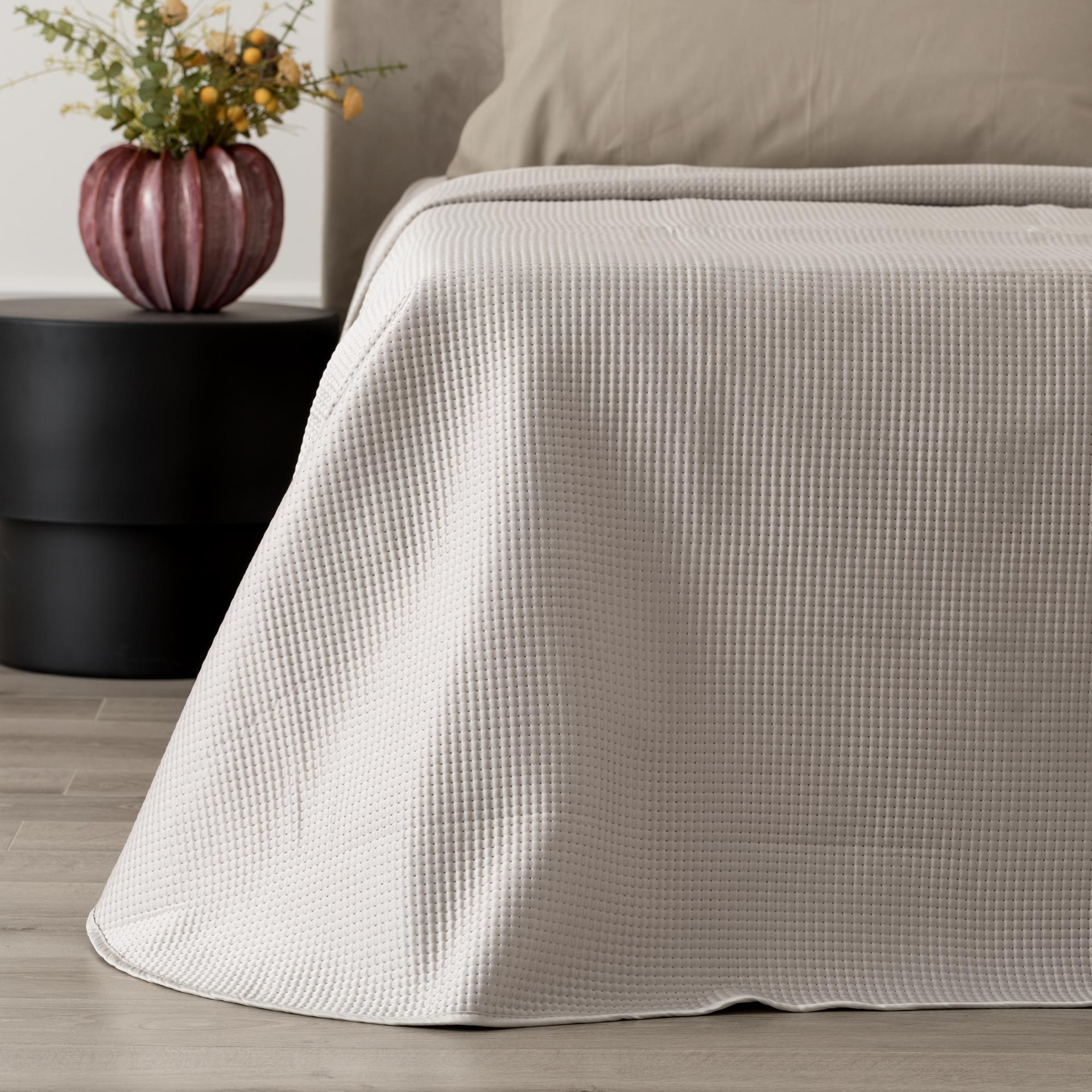 Il Quilt Capri matrimoniale è un trapuntino leggero dallo stile essenziale, pensato per chi desidera un letto ordinato e contemporaneo senza rinunciare alla praticità. Realizzato con esterno in 100% poliestere e imbottitura in poliestere da 100 gsm, offre una copertura ideale per la mezza stagione o per camere ben temperate. La lavorazione termosaldata satin crea una superficie uniforme e compatta, con una texture discreta che dona profondità visiva al letto mantenendo un’estetica pulita e raffinata.
